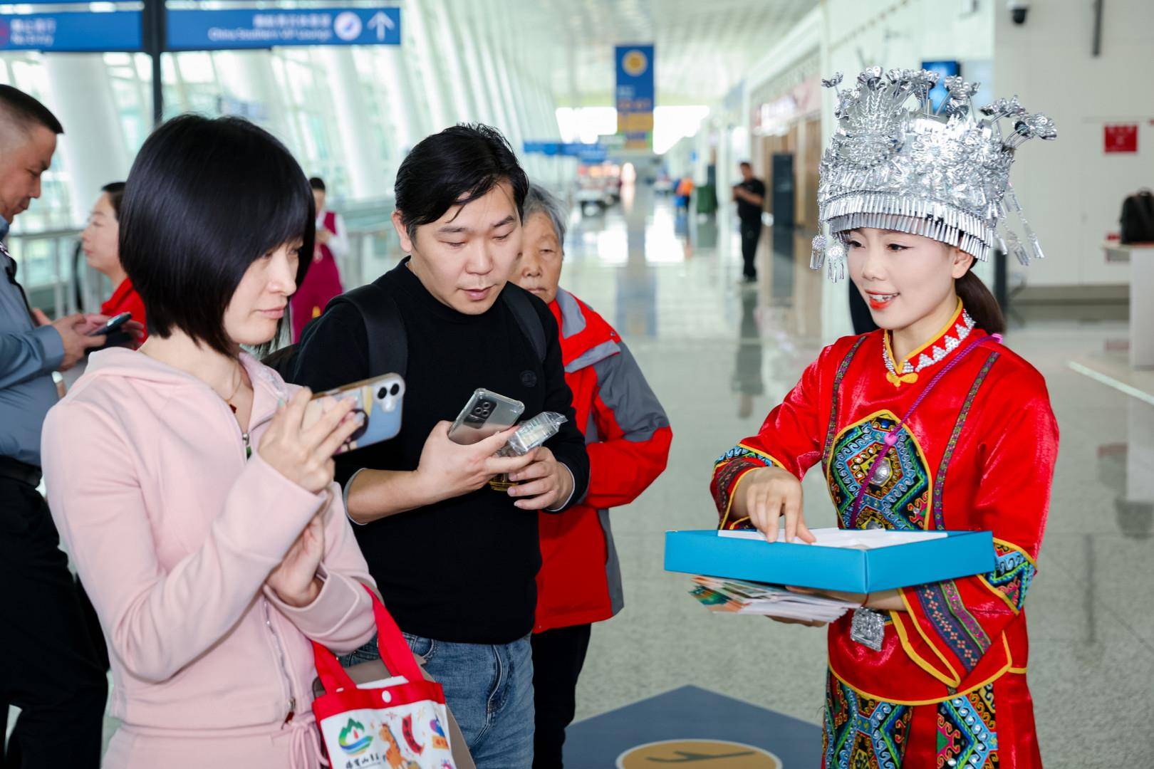 启动仪式结束后,由恩施八县市和机场工作人员组成的特色巡游方阵从“一见钟琴”舞台出发,沿T3航站楼四层出发大厅核心区域巡游展演。摆手舞、龙船调、傩韵鹤峰、土家服饰走秀等节目接连亮相,演员们身着绚丽土家盛装,向旅客赠送香包、推介恩施美景,邀请大家学跳摆手舞、试戴傩面具,沉浸式互动让航站楼内笑声不断。恩施玉露、利川红等硒茶品鉴包,西兰卡普织锦书签、景区体验门票等特色伴手礼,也让旅客把一份“恩施记忆”装进行囊。