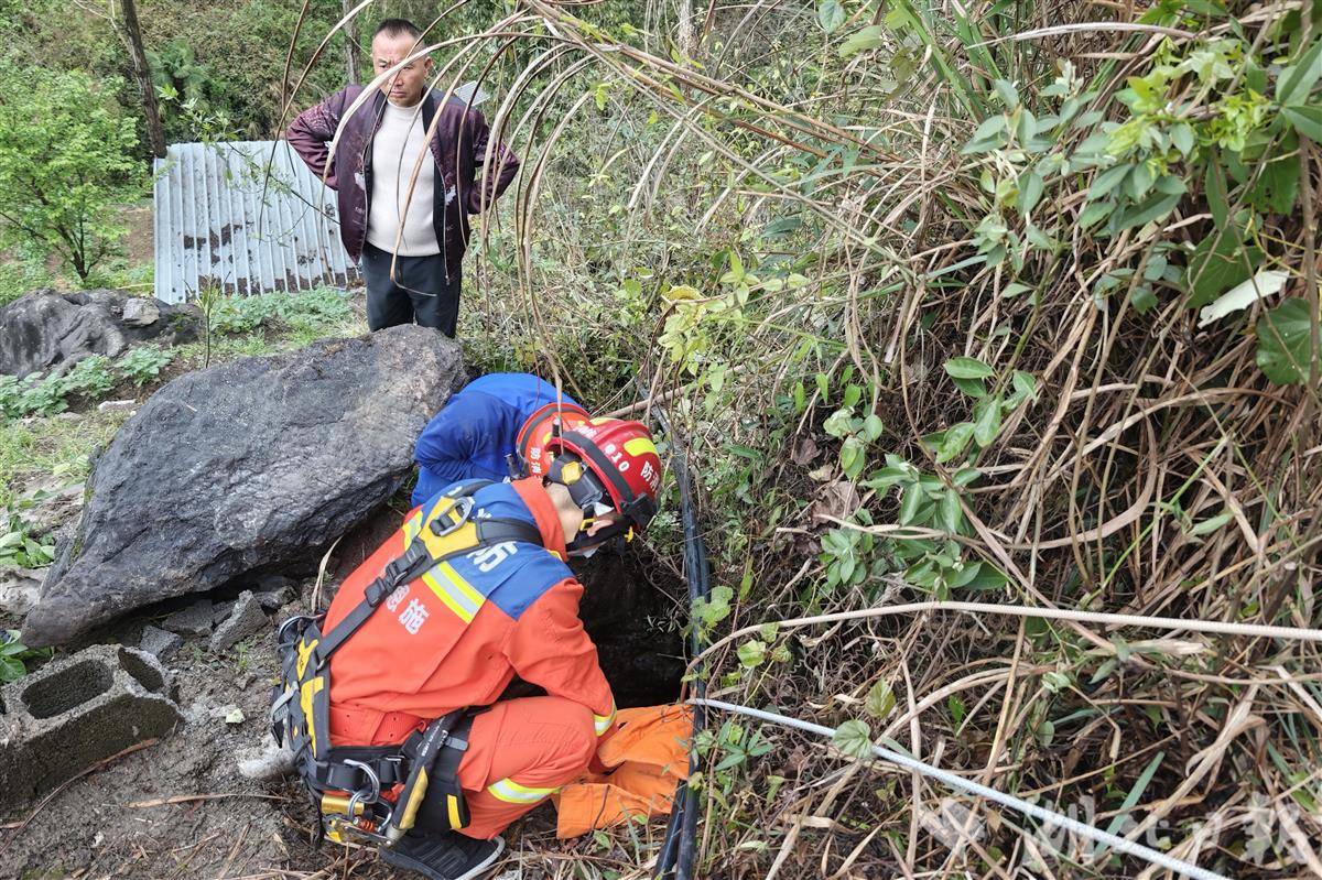 消防救援人员赶到现场发现,该天坑洞口狭窄且有一块大石遮挡,农户家中污水排放至此,洞口蚊虫较多,无法判定洞内空间及深度,该女子所掉落位置位于深坑底部,意识较为清晰,情况十分紧急。