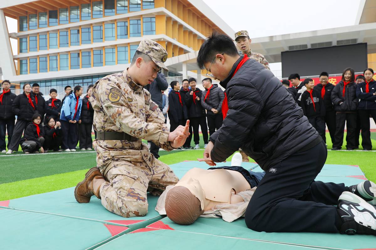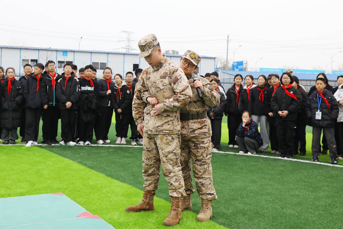 近日,武警湖北总队荆门支队官兵深入驻地中学,以“军民同心护校园,安全教育伴成长”为主题,开展了一场融合仪式教育、安全演练、技能实训为一体的安全教育活动。荆门龙泉初级中学200余名师生与支队官兵一道,在沉浸体验中感悟国防力量,在互动学习中掌握安全技能,共上一堂特殊的“春日安全课”。