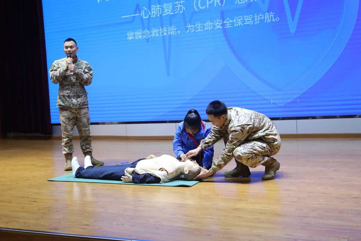 理论宣讲之后,急救技能训练环节同步展开。支队医师现场示范心肺复苏、海姆立克急救法等实用急救技能,从动作要领、操作步骤到注意事项逐一细致讲解。为确保每名师生都能学懂练会,官兵采取一对一指导的模式,分组带领学生进行实操练习,纠正不规范动作,强化肌肉记忆。