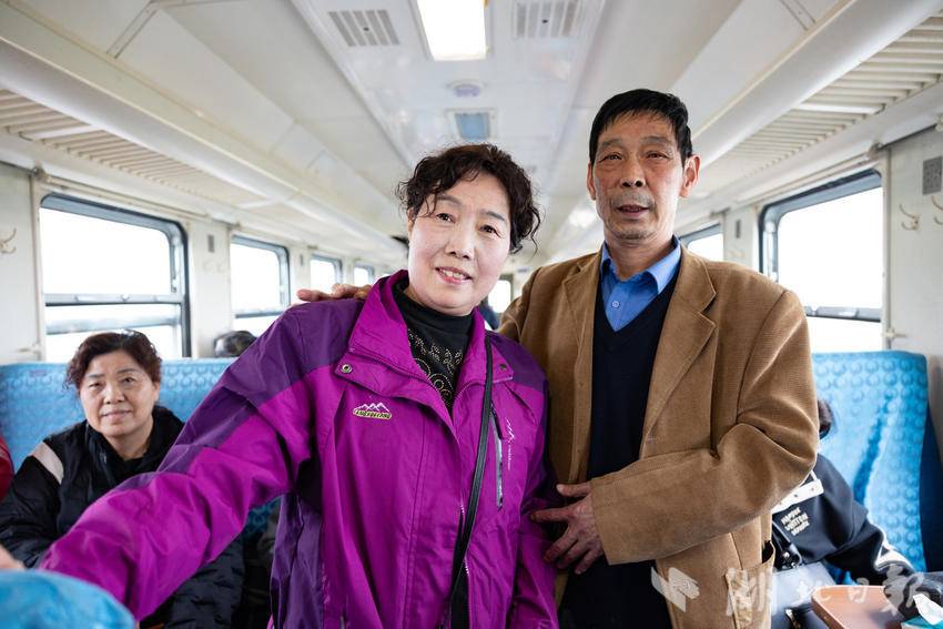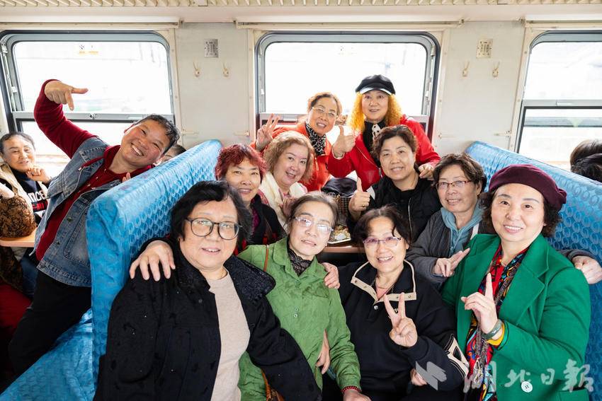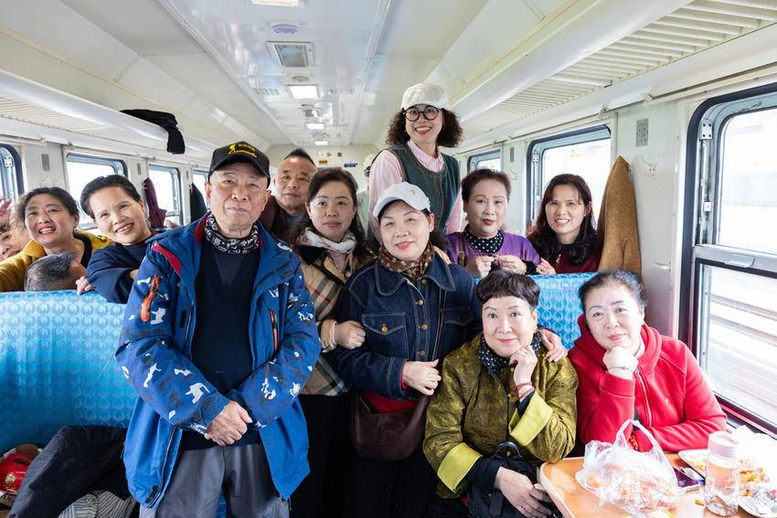 图为市民游客在列车上合影留念。