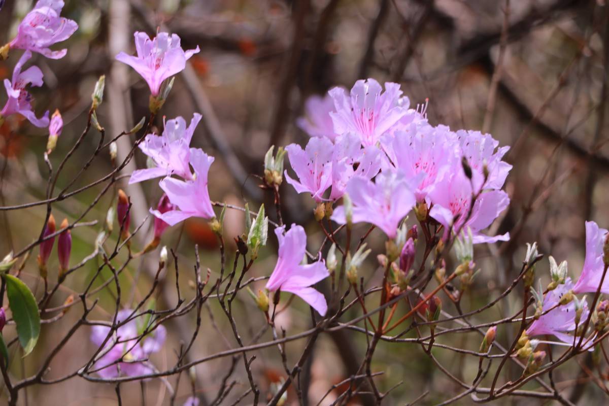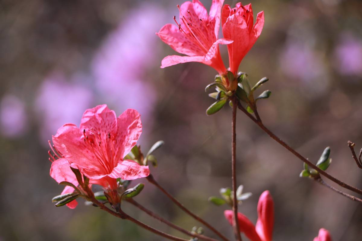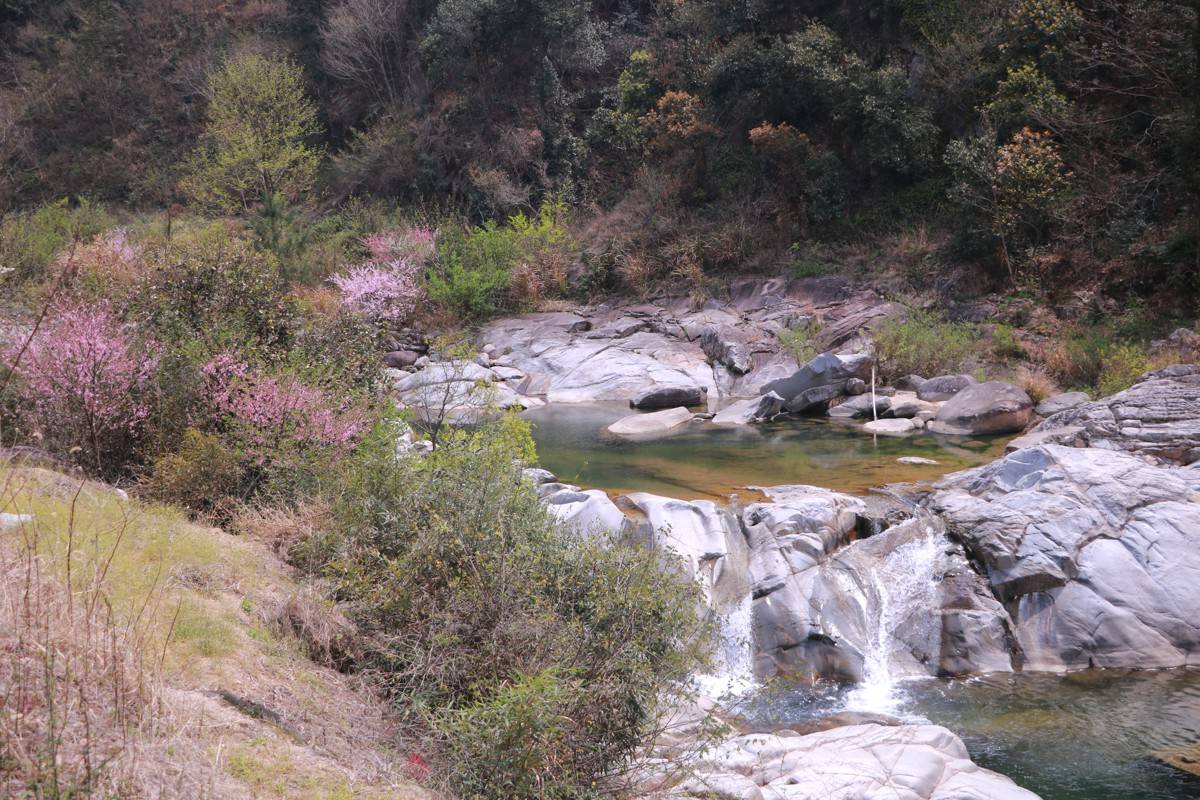 一路前行,随处可见桃花、映山红等春季花卉,花瓣随风飘落,顺着婉转曲折的山溪,铺就一条“桃源小路”,游人行走其间,恍若穿越世外桃源。桃花小道两侧,山溪边的石头、木枕小径,与藤蔓缠绕的绿树相映成趣。