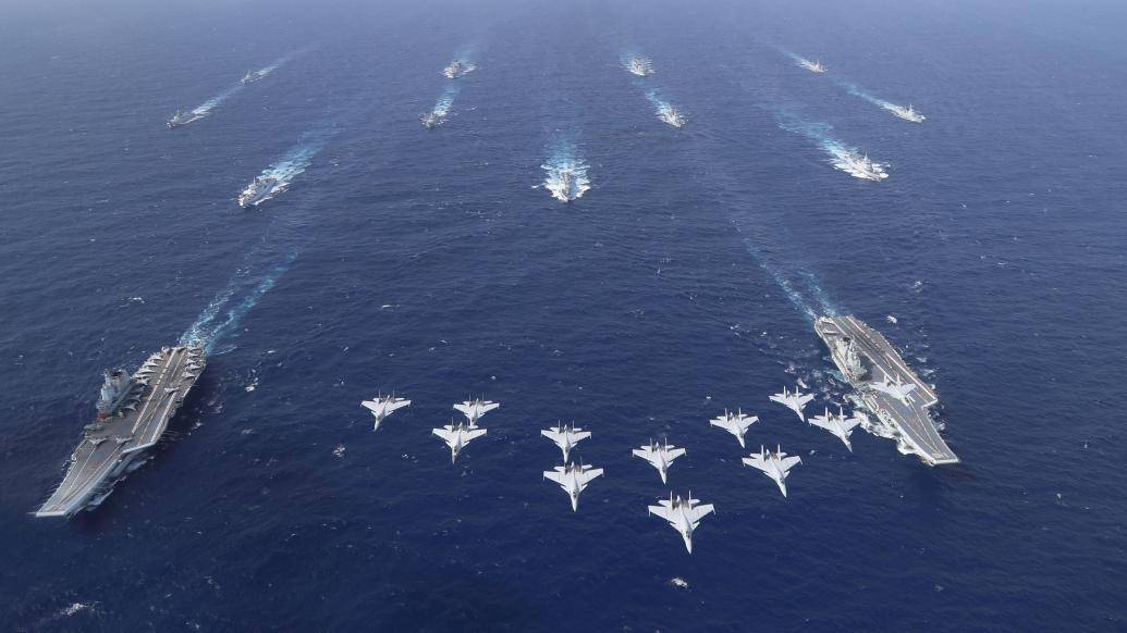 2024年,辽宁舰、山东舰编队首次开展双航母编队演练。新华社 图