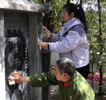 退伍老兵王清海和女儿擦拭墓碑
