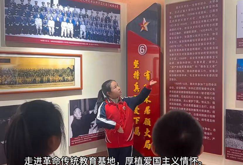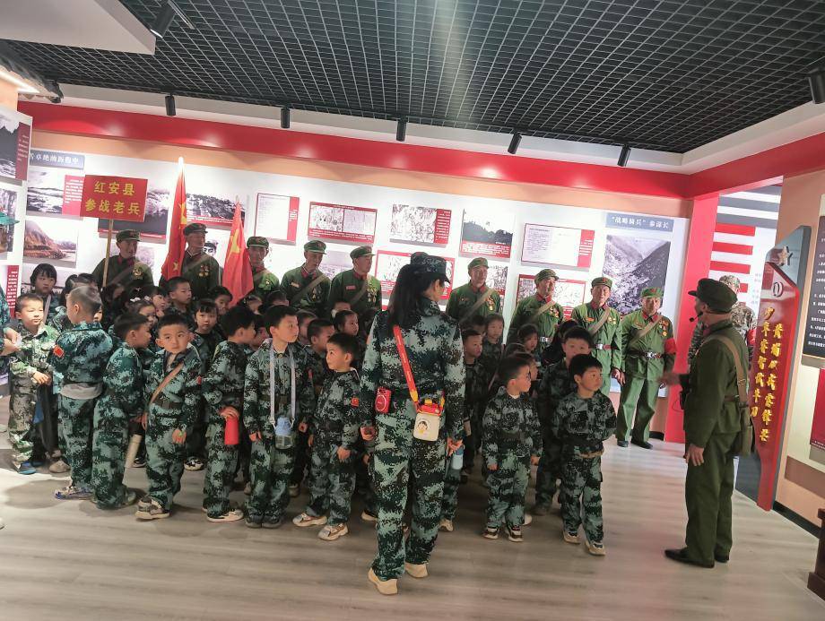 在郭天民上将纪念展厅,参战老兵与幼儿园的小朋友一起缅怀革命先烈,厚植爱国主义情怀,并合影留念,一老一少接力传承,共同见证今天的幸福生活。