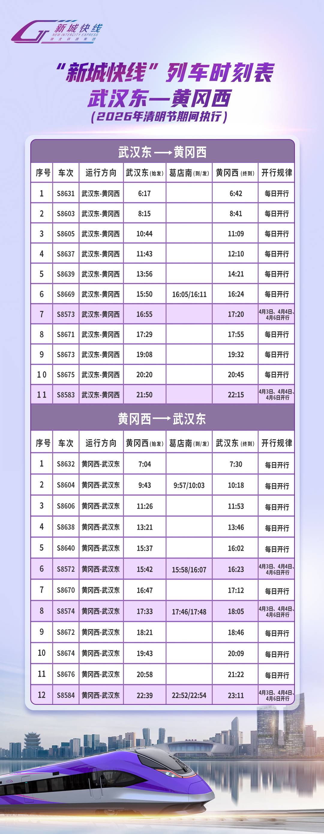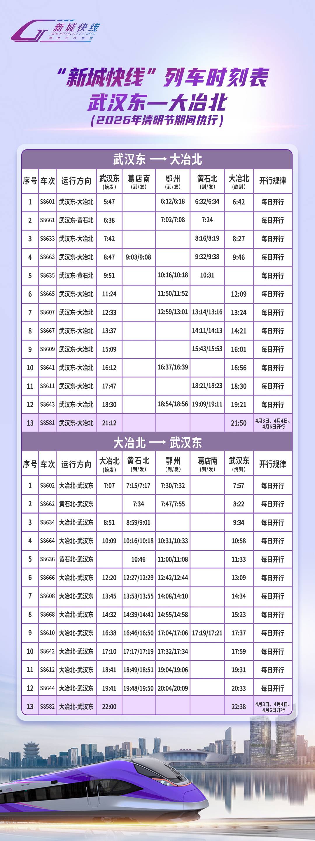 湖北日报讯 (通讯员李晶晶)来自湖北铁路集团轨道运营有限公司的消息,4月3日、4月4日、4月6日,“新城快线”将按49列/日开行,新增假日临时列车7列/日,其中武汉东至大冶北方向1列,大冶北至武汉东方向1列;武汉东至黄冈西方向2列,黄冈西至武汉东方向3列。具体列车开行时刻表如下: