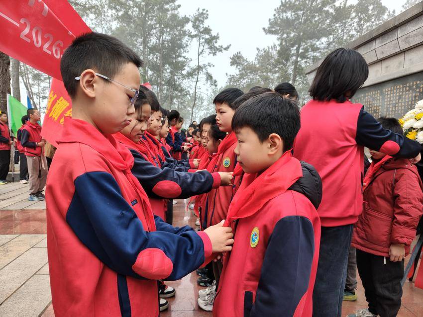 上午九点,活动在校园鼓乐队铿锵的锣鼓声中拉开序幕。全体师生肃立在烈士纪念碑前,齐唱国歌,向为民族独立和人民解放事业英勇献身的革命先烈敬献花篮、默哀致敬。“我是中国少年先锋队队员,我在队旗下宣誓……”入队仪式上,全体少先队员高举右拳,重温入队誓词,铮铮誓言在陵园上空久久回荡。在纪念馆,学生跟随讲解员的脚步,回顾赵家棚抗日革命根据地曾经的烽火岁月,聆听李先念等老一辈革命家在此战斗的光辉历史。泛黄的历史照片、斑驳的抗战文物,将红色记忆深深烙印在孩子们心中。