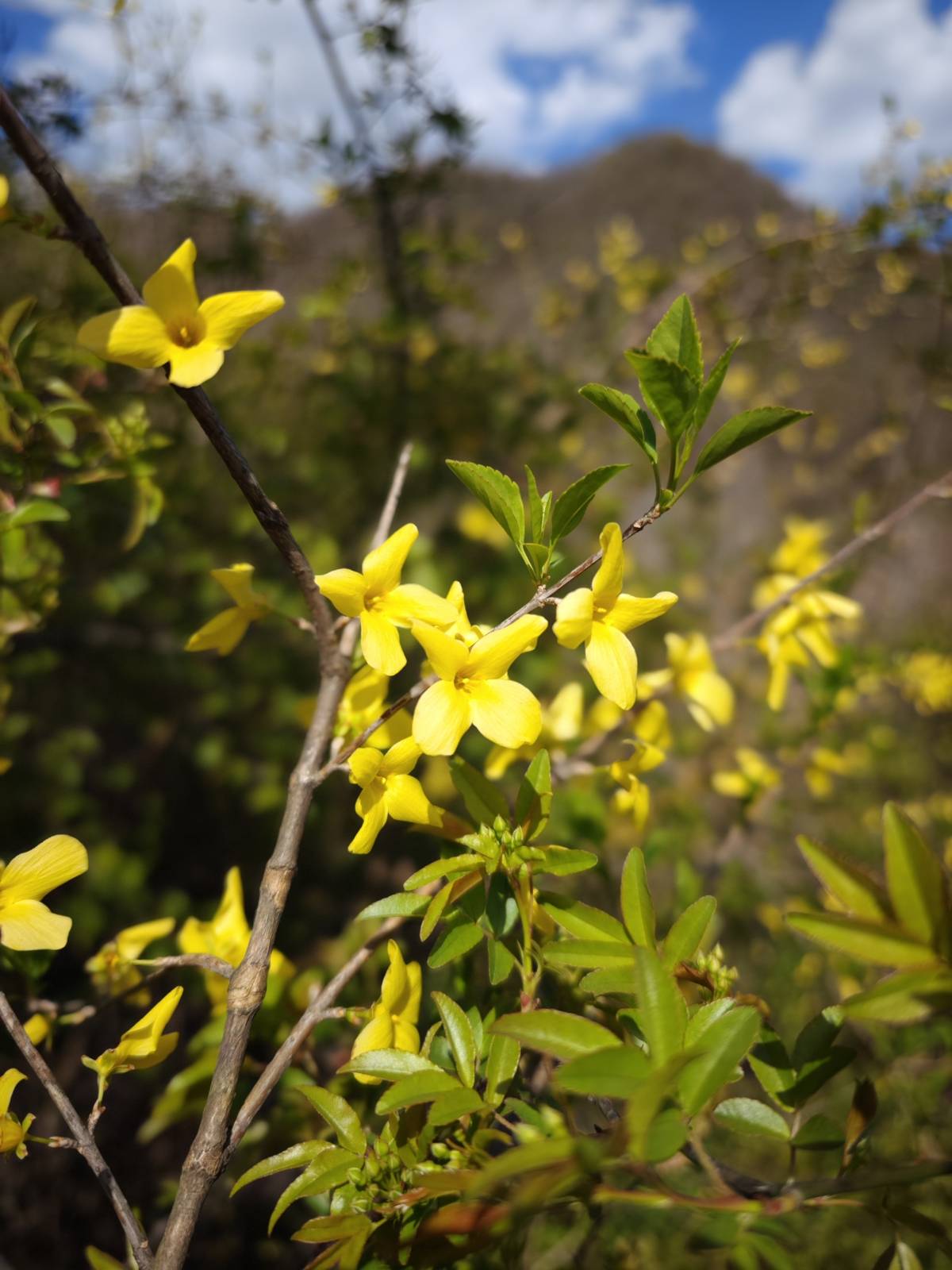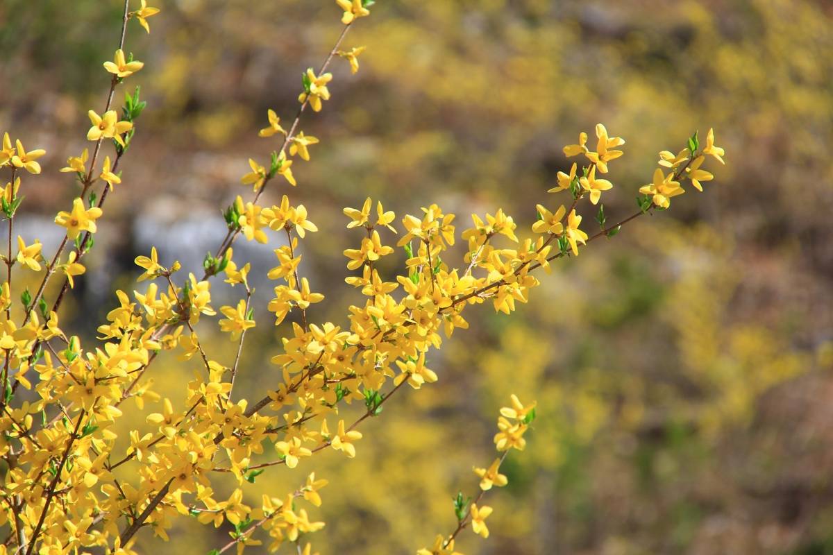 郧阳区大柳乡山上盛开的连翘花。