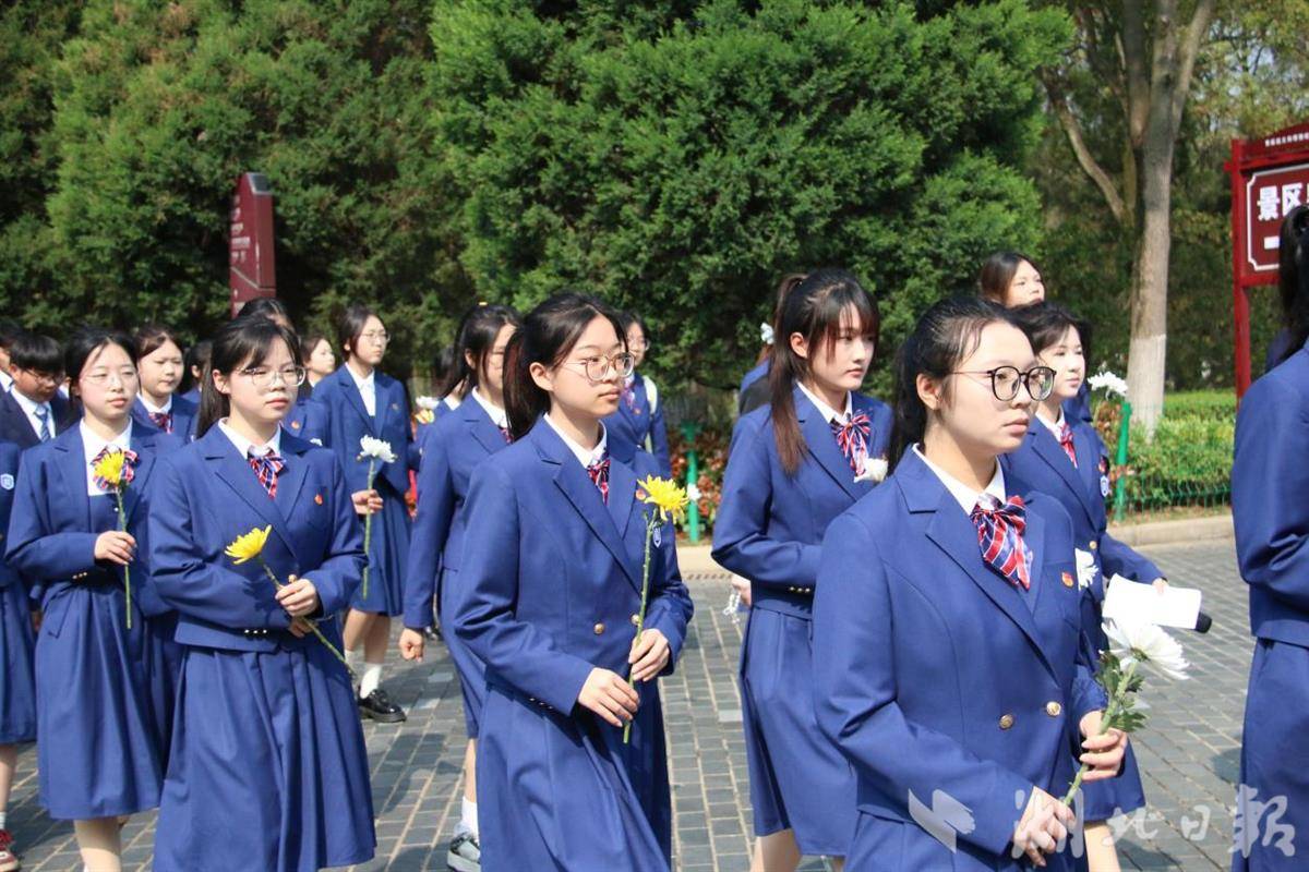 在黄麻起义和鄂豫皖苏区革命烈士纪念碑前,师生整齐列队,举行敬献花篮仪式。默哀毕,师生代表上前整理花篮缎带,依次来到英烈墙前,献上手中鲜花,驻足凝望墙上镌刻的姓名。