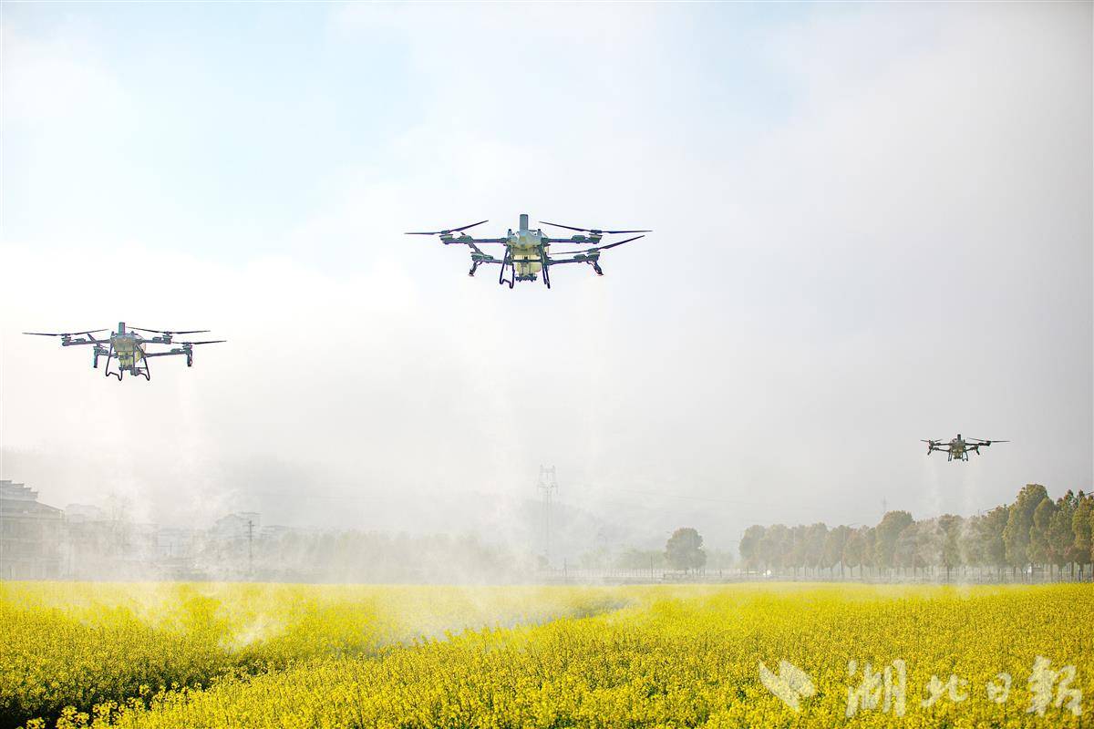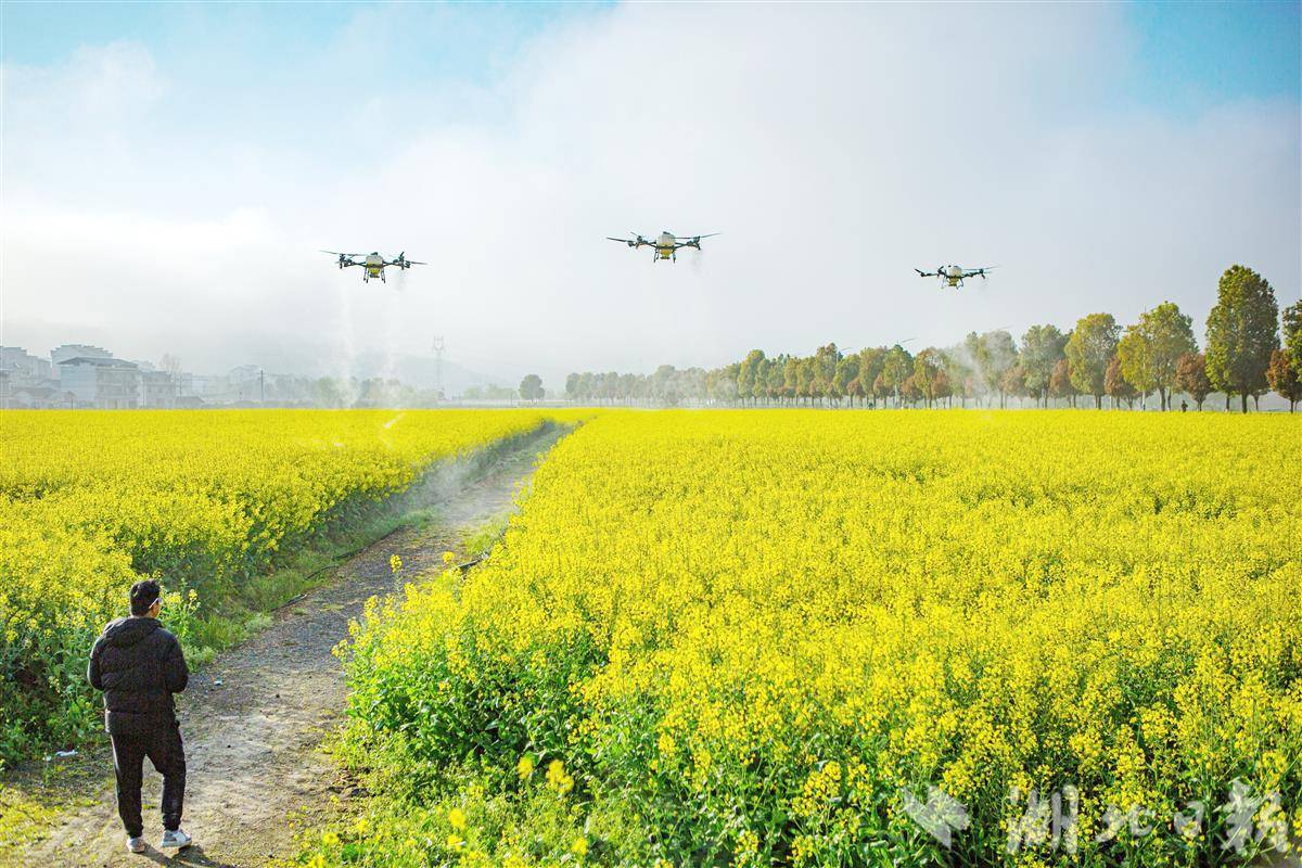 4月1日,在竹山县麻家渡镇营盘河村的油菜田里,技术人员正操控植保无人机穿梭于金黄花海之间,高效开展油菜“一促四防”管护作业。
