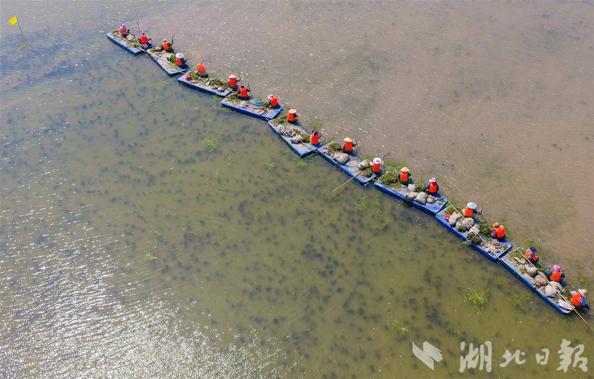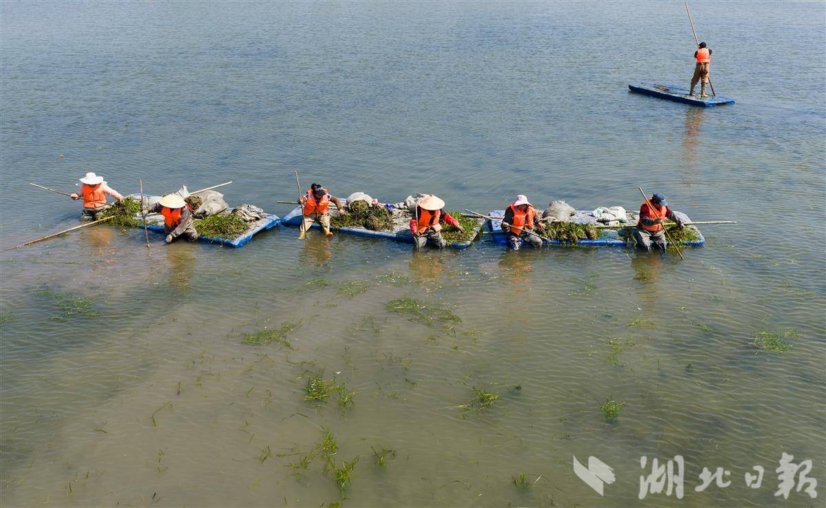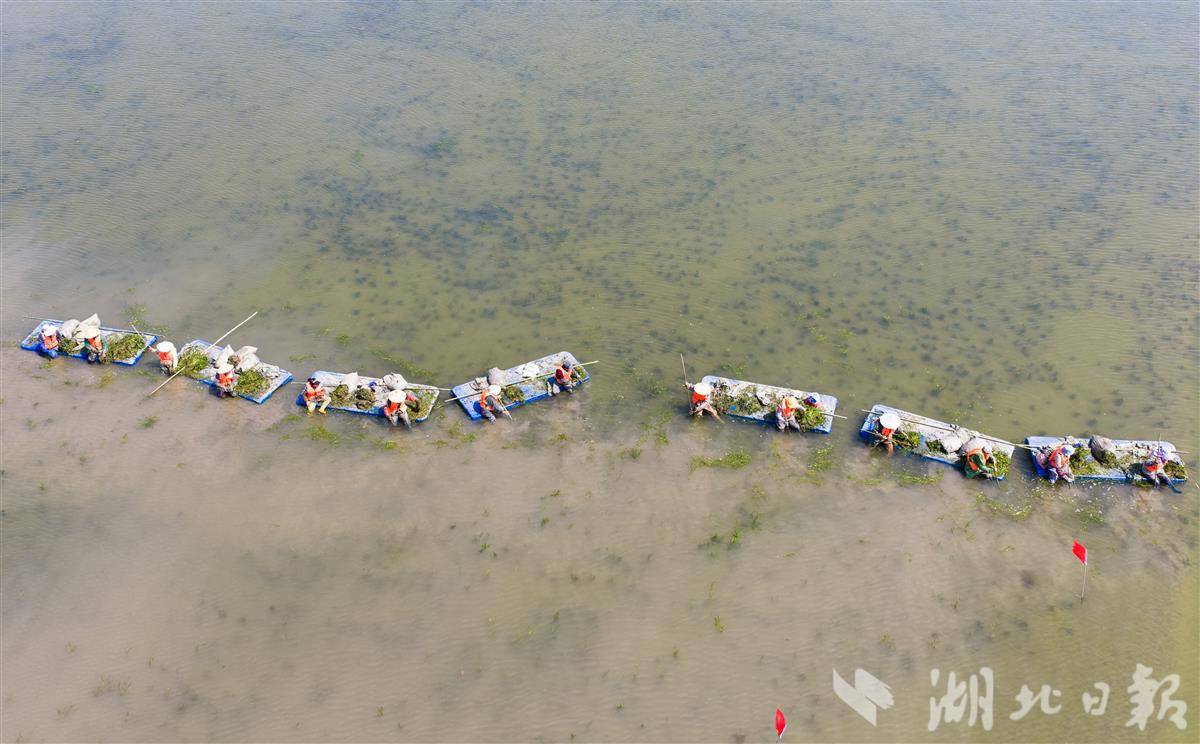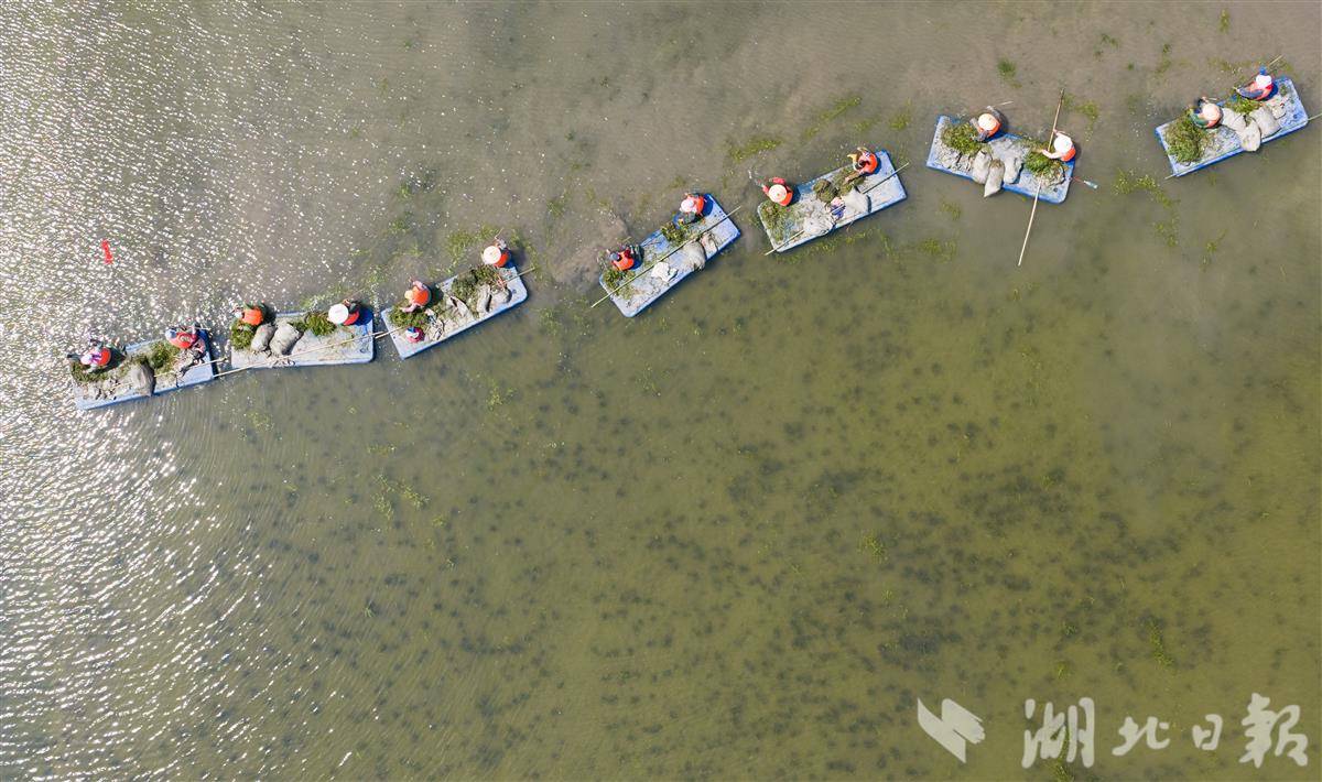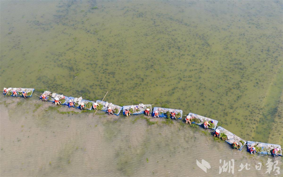4月1日,洪湖入湖口生态修复项目(一期)现场,水面清澈,阳光直透水底,水下植物摇曳可见,工人们正在船上栽种沉水植物苦草。 该项目是洪湖治理“活水、净水、复绿”的关键一环。眼下,工人正抢抓春季施工窗口期,在4350亩生态湿地里分区种下芦苇、苦草等本土水生植物,形成从岸边到深水的完整植被带。项目建成后,不仅能有效拦截入湖污染物,还能为洪湖提供稳定的水生植物种源基地。目前洪湖水质稳定保持在Ⅳ水平,水生植被覆盖率提升至32.5%,生态稳步向好。(湖北日报全媒记者 薛婷 刘郸 通讯员 罗东平 摄)
