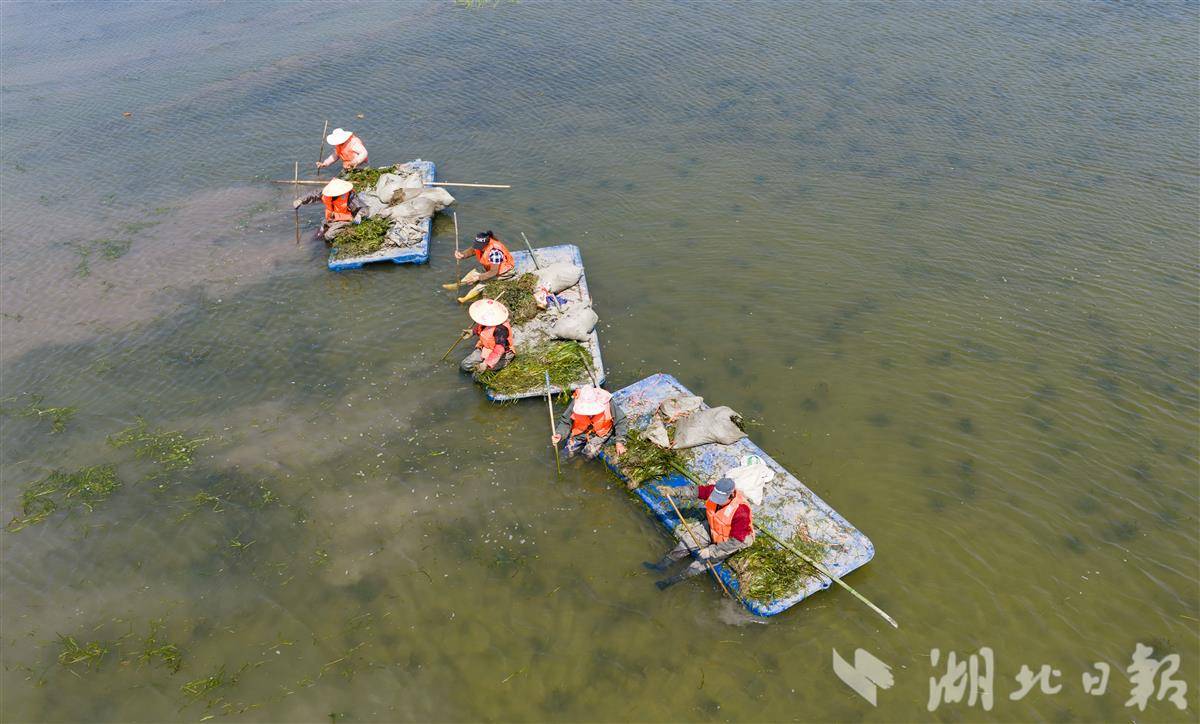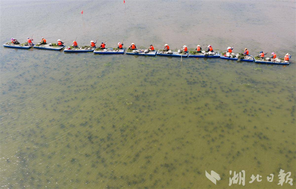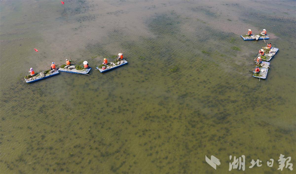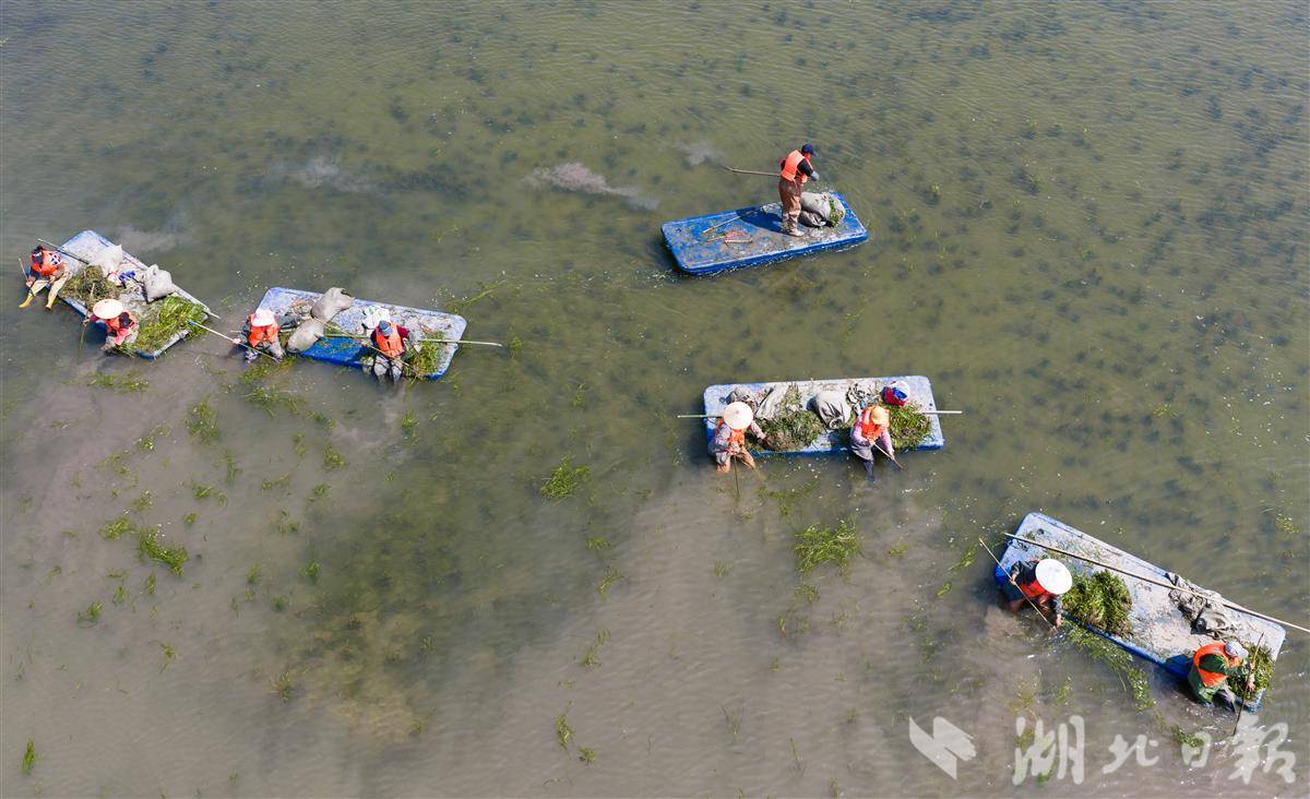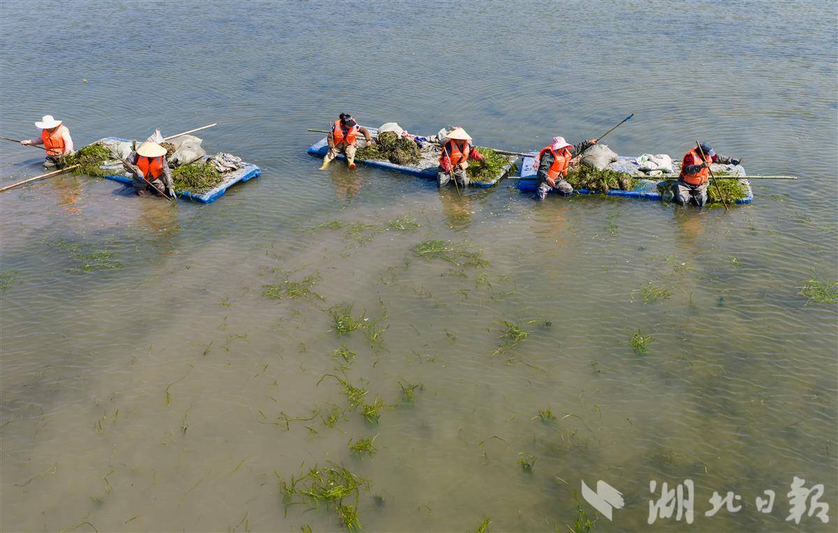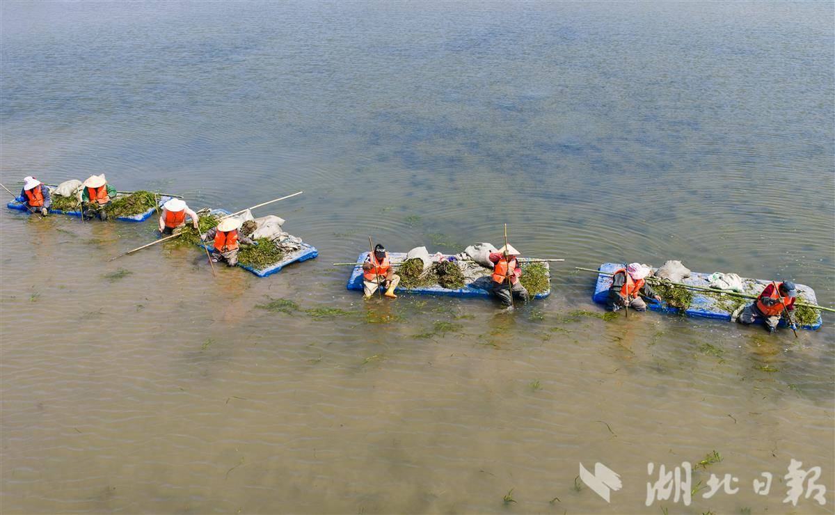 4月1日,洪湖入湖口生态修复项目(一期)现场,水面清澈,阳光直透水底,水下植物摇曳可见,工人们正在船上栽种沉水植物苦草。 该项目是洪湖治理“活水、净水、复绿”的关键一环。眼下,工人正抢抓春季施工窗口期,在4350亩生态湿地里分区种下芦苇、苦草等本土水生植物,形成从岸边到深水的完整植被带。项目建成后,不仅能有效拦截入湖污染物,还能为洪湖提供稳定的水生植物种源基地。目前洪湖水质稳定保持在Ⅳ水平,水生植被覆盖率提升至32.5%,生态稳步向好。(湖北日报全媒记者 薛婷 刘郸 通讯员 罗东平 摄)