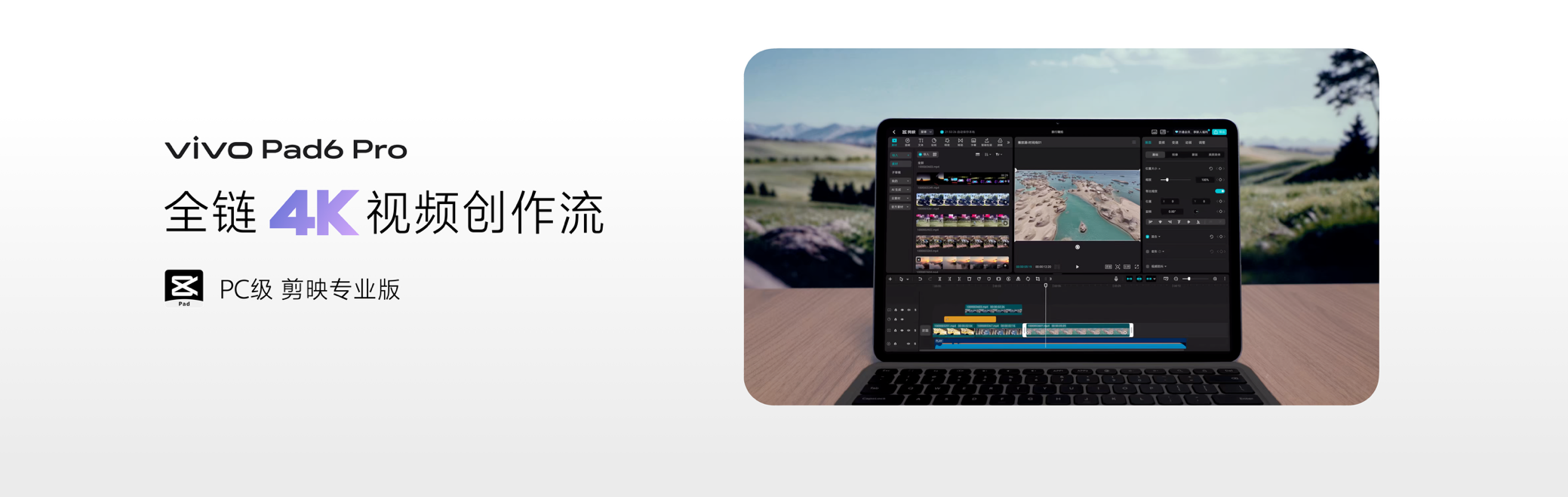 在视频内容创作上,vivo Pad6 Pro依托多设备协同能力,打通从拍摄到后期的一体化创作链路,手机拍摄的4K素材可无损传输至平板进行精细化处理,实现创作流程无缝衔接,全面释放专业级创作生产力。搭配手写笔Pencil3与适配的剪映专业版,在vivo Pad6 Pro上,可高效完成4K素材编辑,无论是多轨道剪辑、特效添加还是素材拼接,都能在13.2英寸4K原彩屏上流畅呈现。画面细节清晰可见,色彩还原精准自然,为视频调色、画面裁切等专业操作提供可靠基础。得益于旗舰级性能平台的加持,素材导入、预览、导出等过程更加顺畅,还能将4K超高清内容上传至社交平台,一站式输出更高品质的作品,满足专业创作者对画质与效率的双重要求。