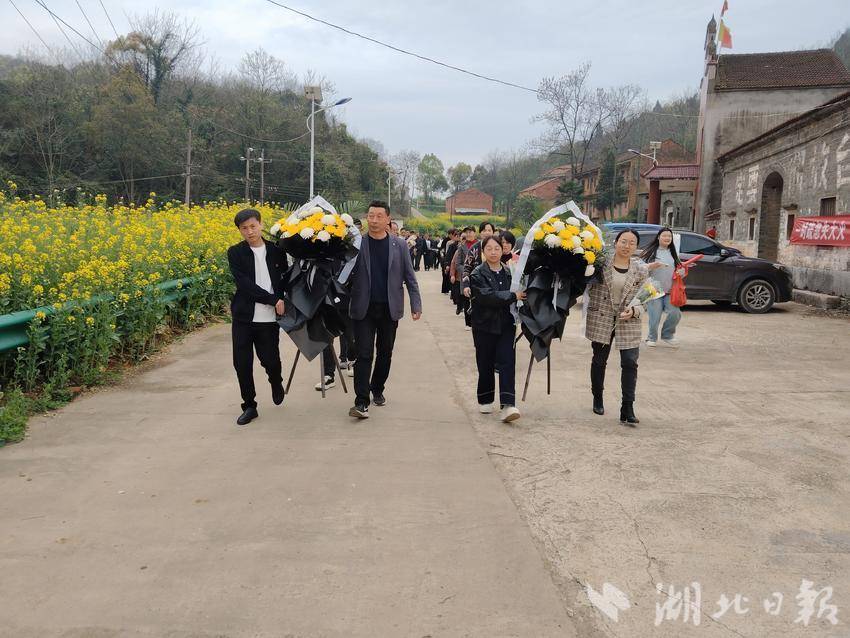 上午,田家镇街道党工委组织委员冯洁、街道党工委宣传委员叶佳丽,与山上社区60余名党员干部、志愿者一同手捧鲜花,徒步1500余米,前往革命烈士汪新墓前。1946年汪新烈士曾担任蕲春、武穴(原广济县)、黄梅县税务局局长,为保护葛麻塘全垸200多名百姓的生命安全,在面对日本侵略者的捆绑时,他假意带领敌人取枪,径直走向葛麻塘东侧的石洞,在距洞口仅五六尺远时纵身跃下,壮烈牺牲,用生命守护了一方百姓。