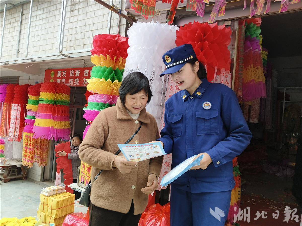 襄阳市保康县消防救援大队宣传员走近选购祭祀用品的市民,为大家讲解清明节期间的防火注意事项,倡导文明祭祀。张纪文/摄
