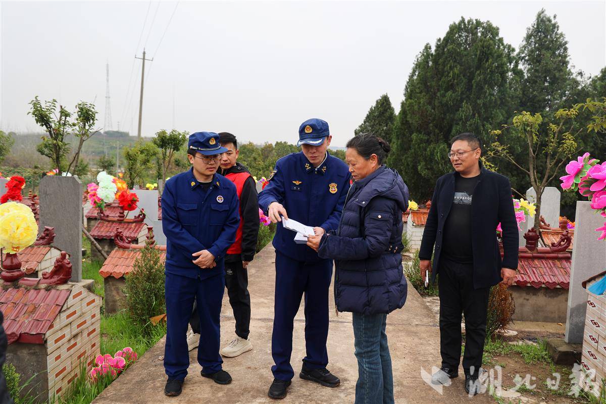 荆门市消防监督员联合社区工作人员在双泉公墓向祭扫群众发放消防安全宣传资料。 魏欢欢摄