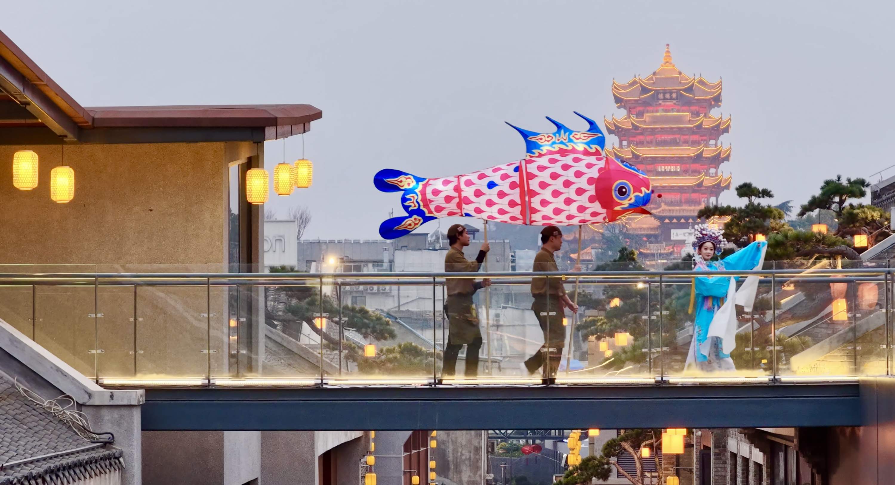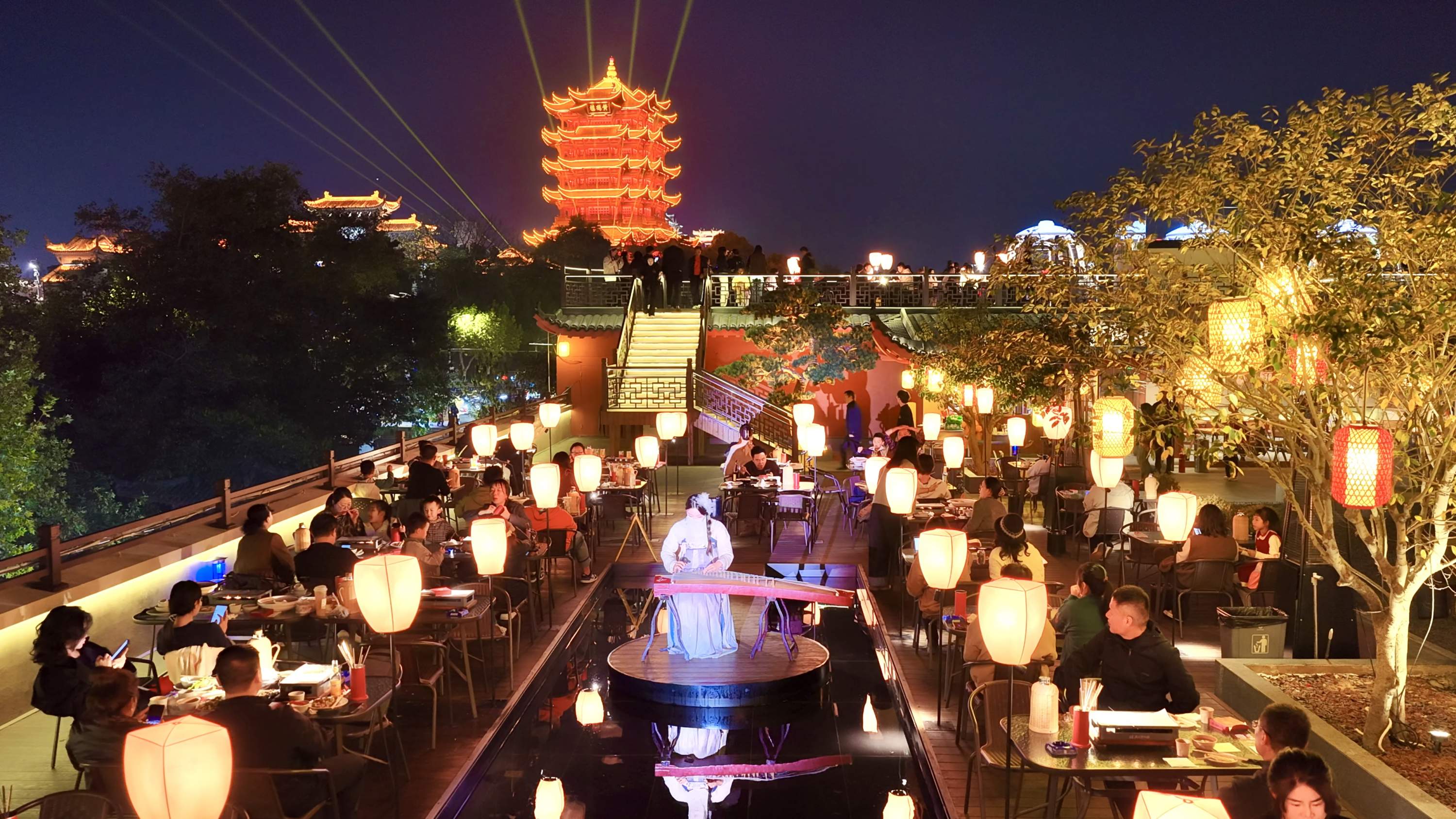 今年2月,“宝记松间火锅”开业。食客静坐松树下,凭栏远眺,黄鹤楼、长江大桥美景尽收眼底。身着戏服的演员在鲜花连廊上,舞动长袖表演《西厢记》《牡丹亭》,与背后的青瓦黛墙、苍松翠影相映成趣。