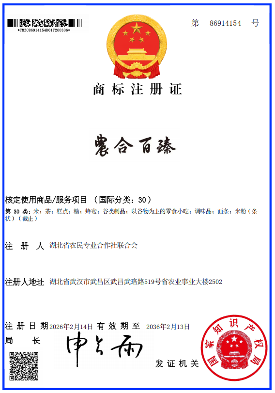 据悉,“农合百臻”由湖北省农民合作社办公室指导开发,由湖北省农民合作社联合会、湖北省优质农产品合作社联合社共同运营管理,是面向全省符合条件的农民合作社(联合社)及其关联的家庭农场、企业等经营主体开放使用的省级农产品公用品牌。此次商标成功获批,填补了湖北省农民合作社无省级公用品牌的空白,对整合全省合作社资源、提升农产品市场竞争力具有重要意义。