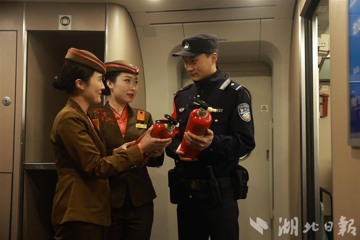 4月3日,清明假期前一天,民警和列车员检查车厢安全设备。