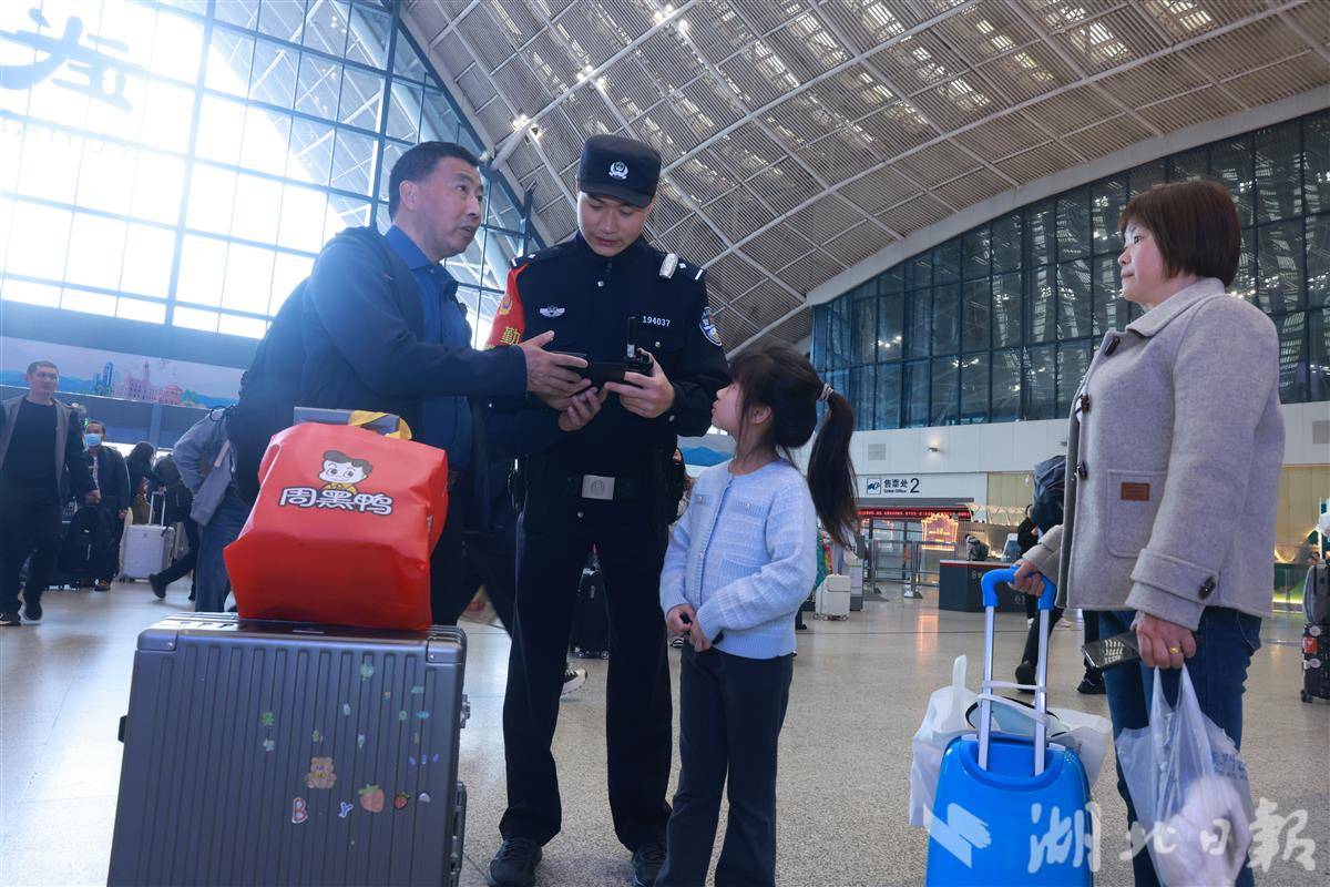4月3日,清明假期前一天,武汉站进站大厅,民警服务求助旅客。