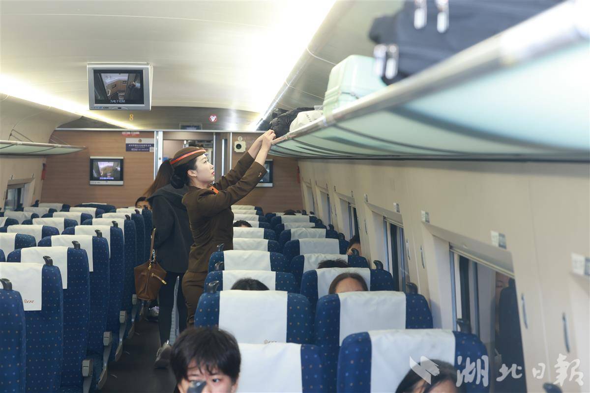 4月3日,清明假期前一天,列车员在检查车厢行李架。