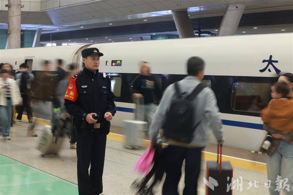 4月3日,清明假期前一天,武汉站迎来出行高峰。据悉,今年清明假期中国铁路武汉局集团有限公司预计发送旅客452万人次、日均90.4万人次,同比增长4.7%。高峰日预计发送105万人次,同比增长2%。武汉铁路警方增加重点部位警力部署,不间断开展秩序维护和客流疏导工作,全力打造安全、有序、温馨的出行环境。武汉客运段织密立体防控网络,推出系列便民举措,让“九省通衢”的交通枢纽,成为旅客出行的温暖港湾。(湖北日报全媒记者 魏铼 通讯员 熊振迪 赵语嫣 摄)