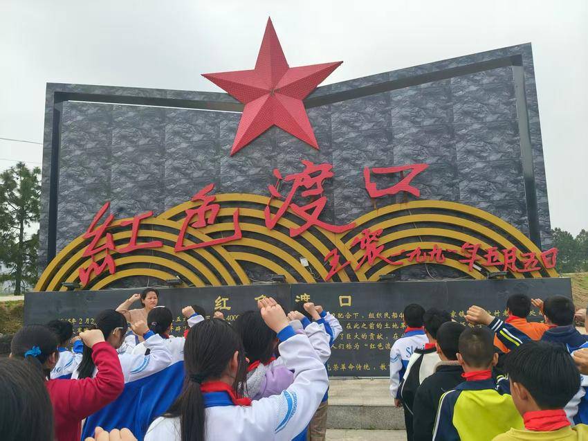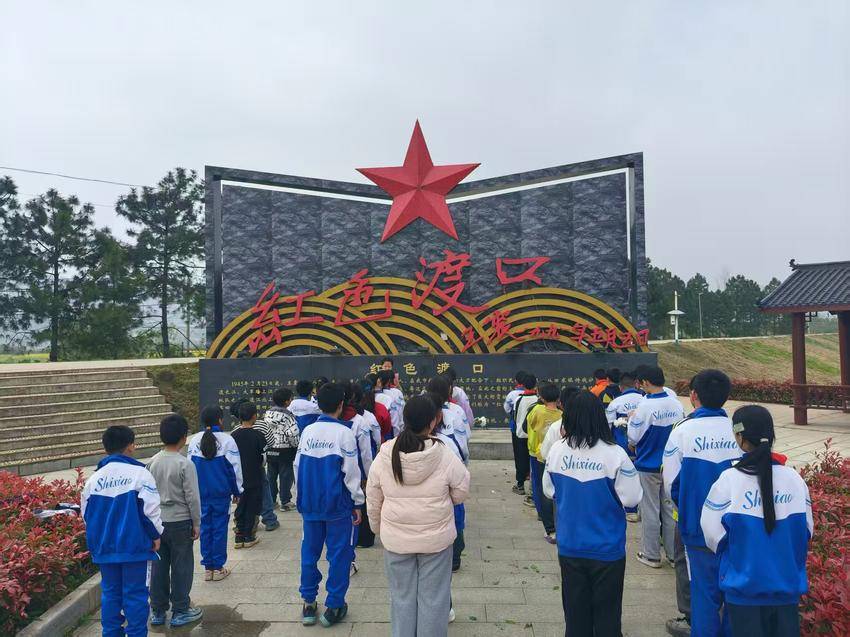 上午9时,研学队伍在学校操场整队出发。学生们身着统一校服,佩戴红领巾,高举校旗与队旗,精神抖擞地踏上行程。全程约6公里的徒步路线,不仅有一路春光、田园景致,还穿插了“红色知识问答”“革命故事分享”等互动环节。老师们边走边讲,结合当地革命历史,讲述了红军战士在渡口周边开展游击战争、护送群众转移的感人故事,让红色精神在行走中悄然浸润心间。