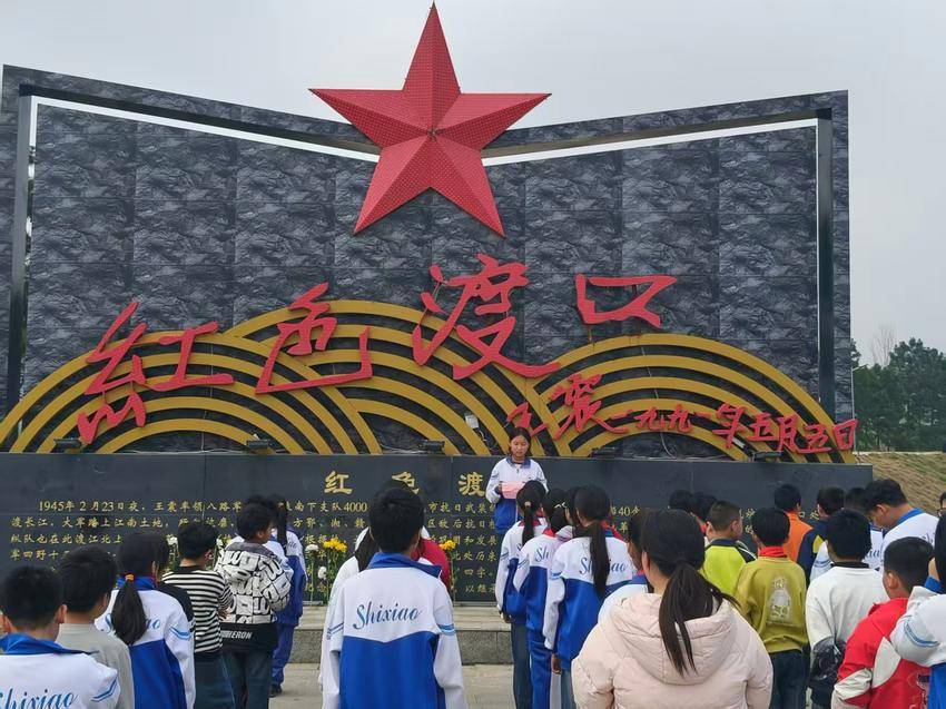 “大家看,前方就是红色渡口了!”经过近两个半小时的步行,队伍抵达目的地。静静流淌的河水、古朴的渡口码头、巍然矗立的纪念碑映入眼帘。全体师生肃立于碑前,向革命先烈鞠躬致敬、敬献鲜花,齐声高唱《义勇军进行曲》。随后,学校政教主任孙珍动情讲述了红色渡口的历史渊源:在革命战争年代,这里曾是红军与地下党组织传递情报、运送物资、转移伤员的重要通道,也是“飞舟抢渡江南”故事的发生地。无数革命先辈在此冒着枪林弹雨,一次次艰难摆渡,用鲜血与生命铸就了不朽的丰碑。