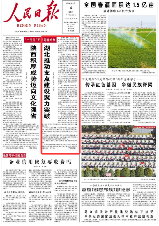 4月4日,《人民日报》在头版头条“‘十五五’开好局起好步”专栏刊发文章《湖北推动支点建设聚力突破》,聚焦湖北以改革创新激活力,努力打造具有全国影响力的科技创新高地。