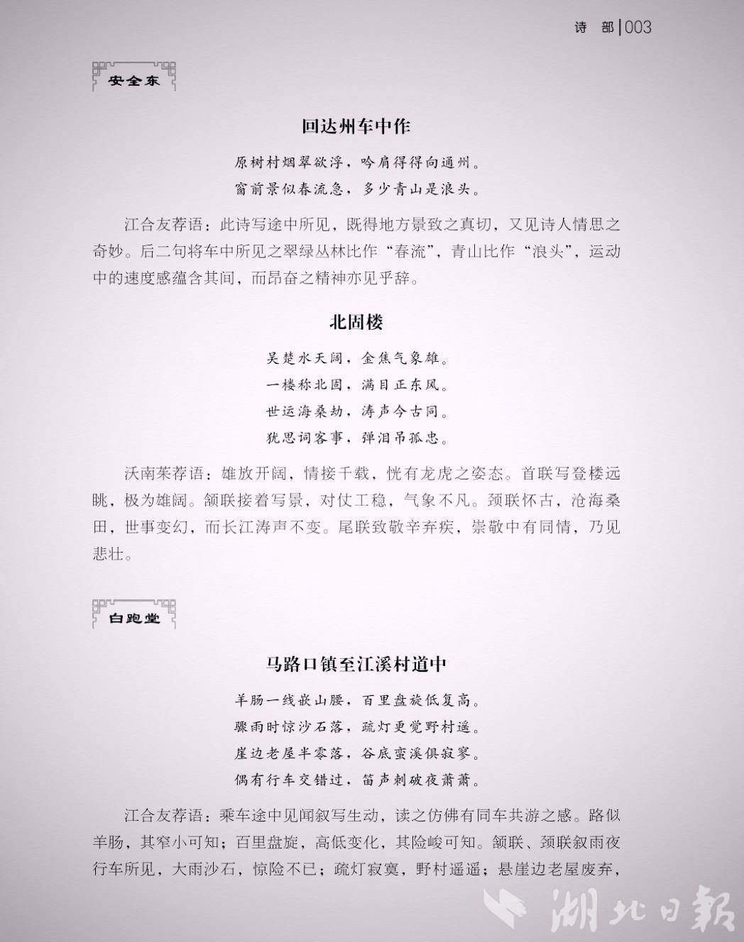 湖北日报讯(记者农新瑜、通讯员沈作)“窗前景似春流急,多少青山是浪头。” 这首由当代作者安全东描写车行途中所见的古体诗《回达州车中作》,出自新近出版的一本大学拓展课程读本。书中,编委江合友教授在推荐语中点评该诗:“运动中的速度感蕴含其间,而昂奋之精神亦见乎辞。”