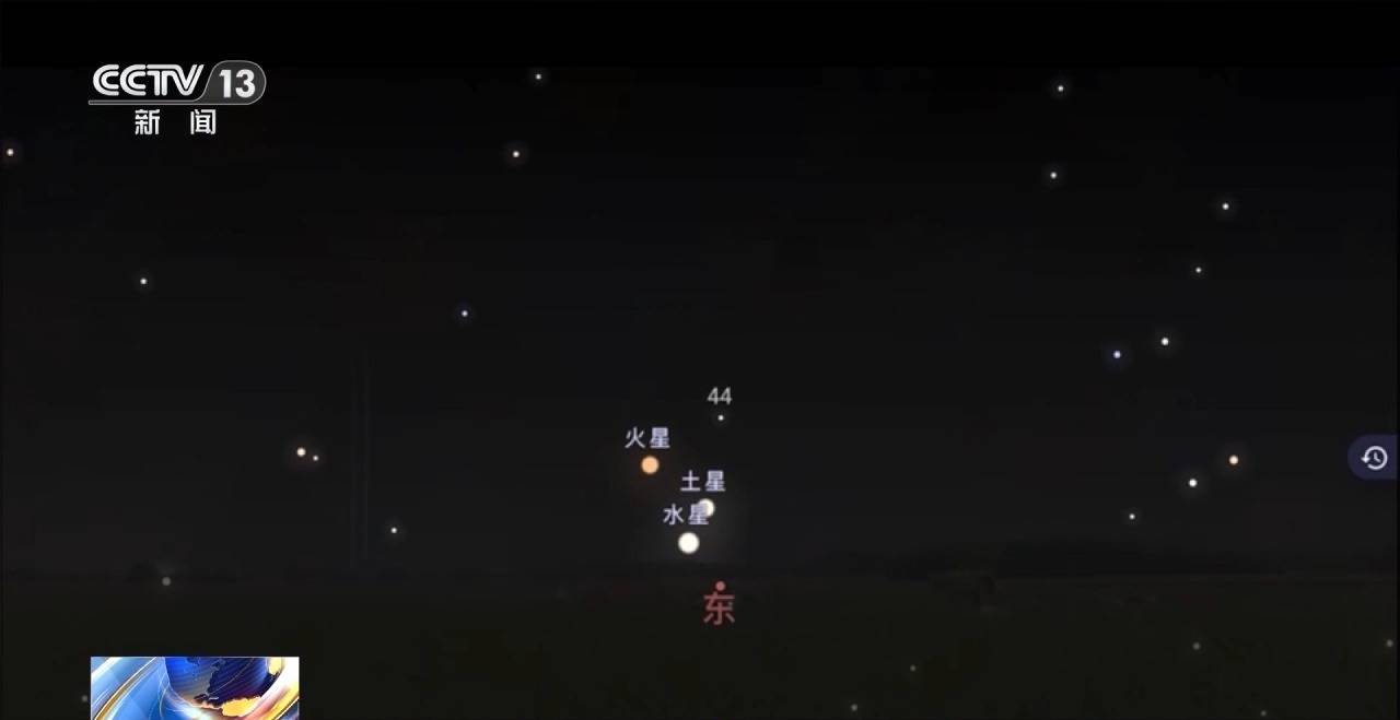 北京天文馆高级工程师 寇文:水星、火星还有土星,它们在早晨天亮以前升出东方地平线,那么三个天体距离分布在大概不到2度的一个范围内,这个距离是非常小的了。