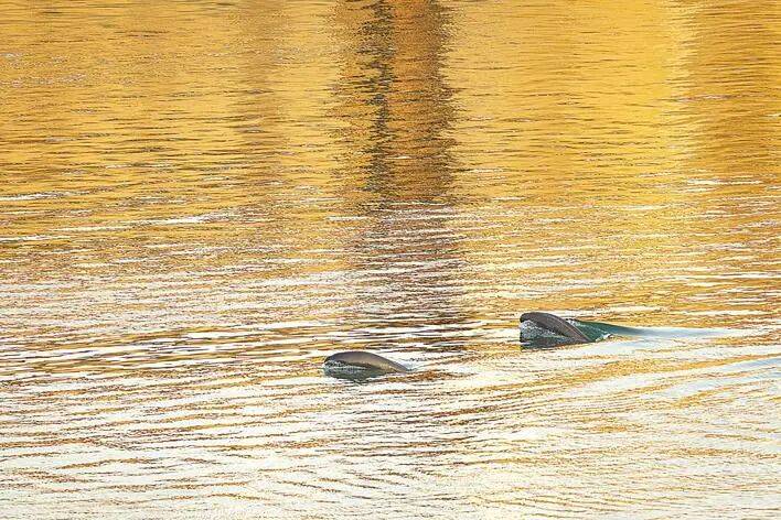 长江江豚在长江宜昌葛洲坝下游附近踏浪前行,与浪花共舞。