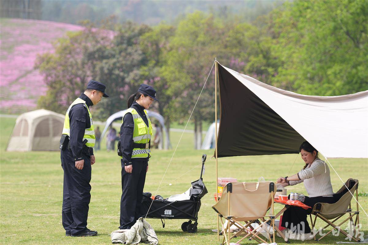 “请问你们是在这里露营吗?有没有使用明火?一定要注意用火安全。”在黄陂区木兰草原景区,黄陂区分局王家河街派出所民警李文笛带队开展巡逻防控。每到一处露营点,民警都细致提醒游客当前枯草较多,严禁违规使用明火,离开时务必彻底熄灭火源。