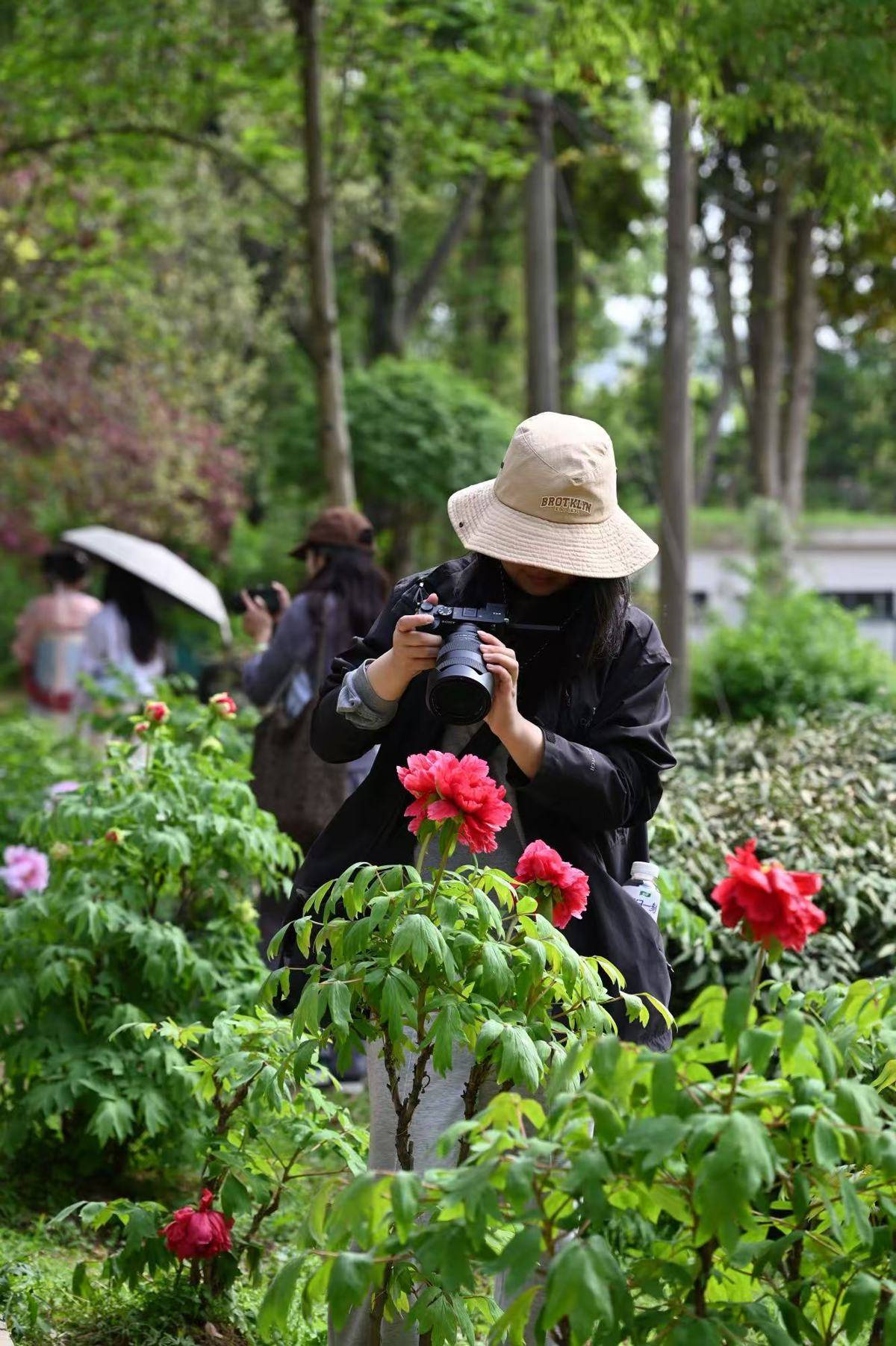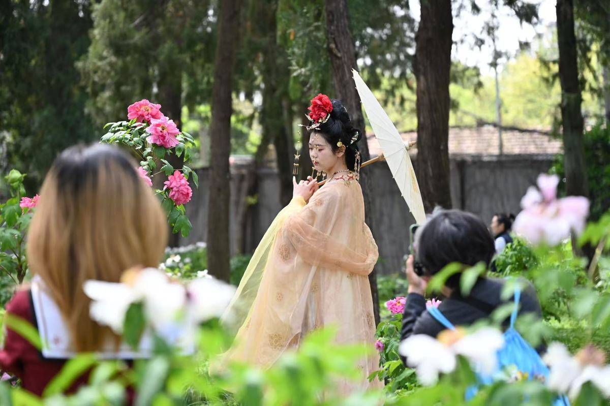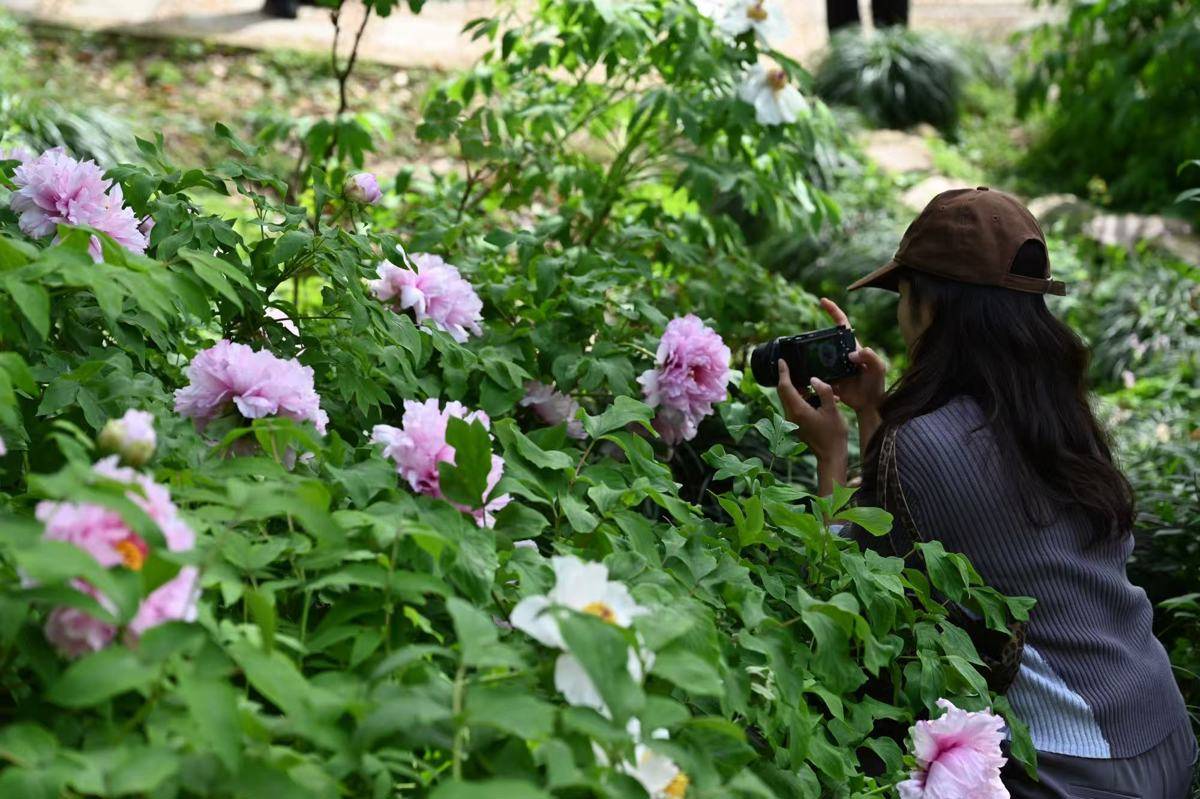 不远处的牡丹园里,同样聚集了不少赏花人。清明首日,正值牡丹最佳观赏期,九大色系、3000余株牡丹已绽放一大半,引得赏花人络绎不绝。来自河南濮阳的王钰女士赞叹:“没想到在武汉也能看到这么多种牡丹,还挺惊喜的。”武汉植物园汇聚了170个品种、3000余株中外牡丹,涵盖红、粉、紫、黑、黄、绿、白、蓝及复色九大色系。率先开放的湖北保康牡丹和凤丹牡丹以白色、粉白色居多,如霞似雪,香气袭人。复色名品“岛锦”一花双色,红粉相间,宛如精工晕染,绚丽夺目;红色系魁首“芳纪”色泽纯正浓烈,被誉为“最红的红牡丹”,在春光下热烈如火。游客穿行于牡丹花径,在缕缕幽香中驻足,在满园芳菲之间,感受着扑面而来的盎然春意。