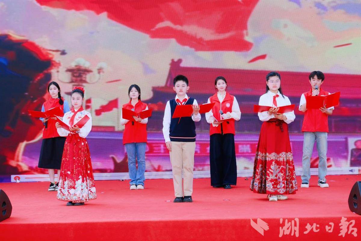研学结束后,学生们走上了2026长江书市·武汉童书展首义广场站的主舞台。大学生与中小学生联袂领诵、合诵《青春中国》《点赞中国》《可爱的中国》,用青春之声礼赞祖国。情景剧《最后的家书》与跨年龄组的“红色配音秀”等节目,让红色经典在新时代语境下焕发出新活力。