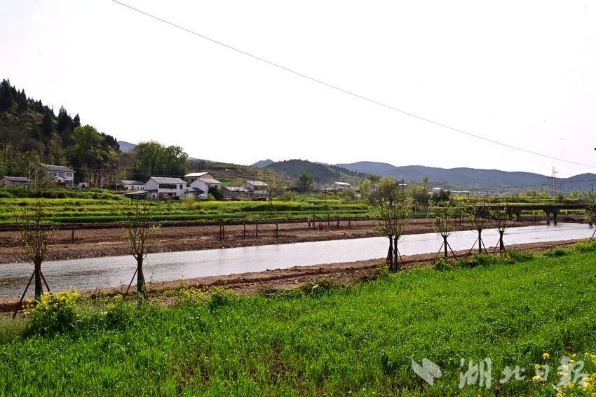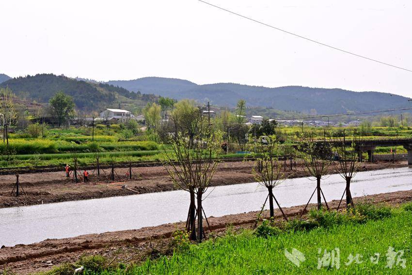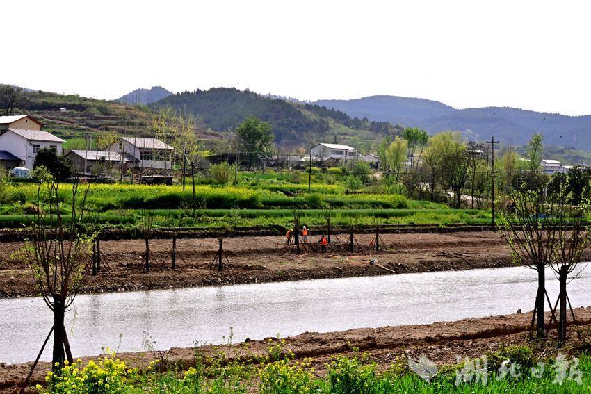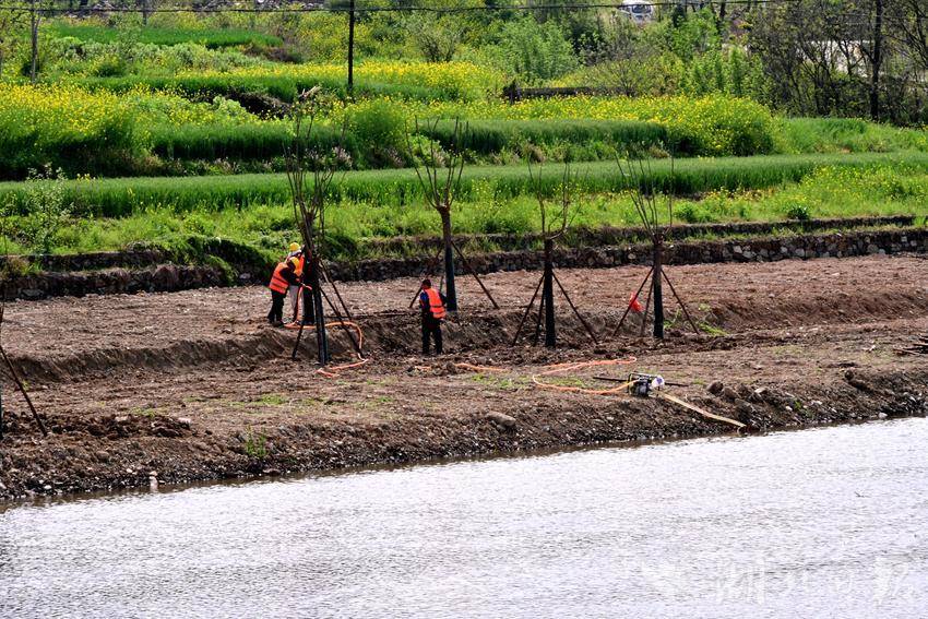 4月3日,在十堰市郧阳区安阳镇陈营村巨家河生态综合治理现场,工人正在河道护岸种植垂柳。清明时节,在十堰市郧阳区安阳镇陈营村巨家河生态综合治理现场,工人加快种植喜水植物,绿化美化护岸。