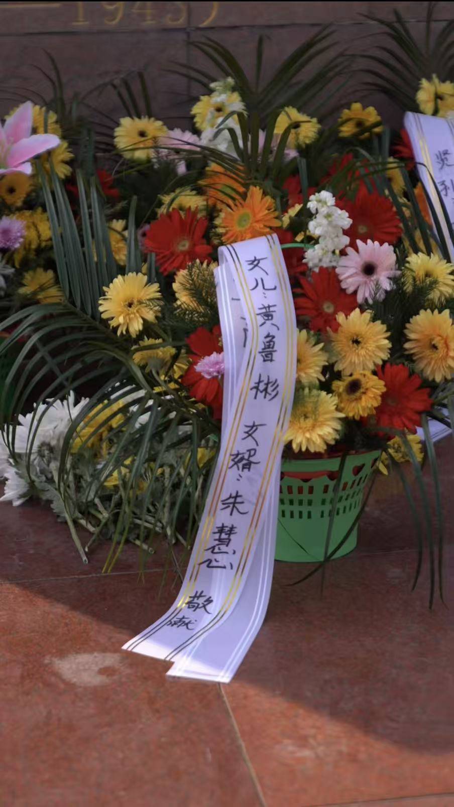 雄壮的国歌声中,黄鲁彬一行向父亲雕像三鞠躬,并敬献鲜花。