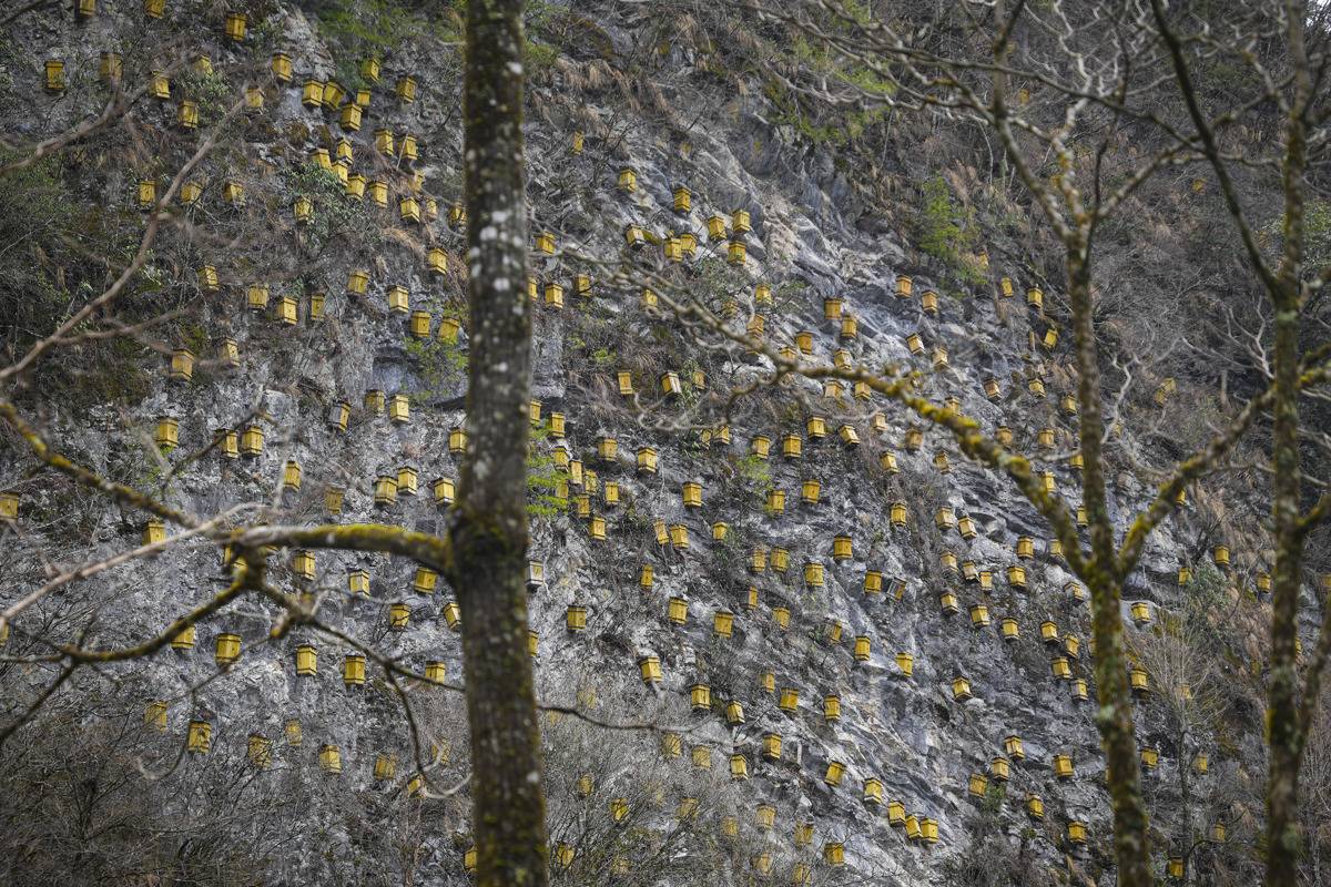 吴家庵保种场崖壁上悬挂的蜂箱