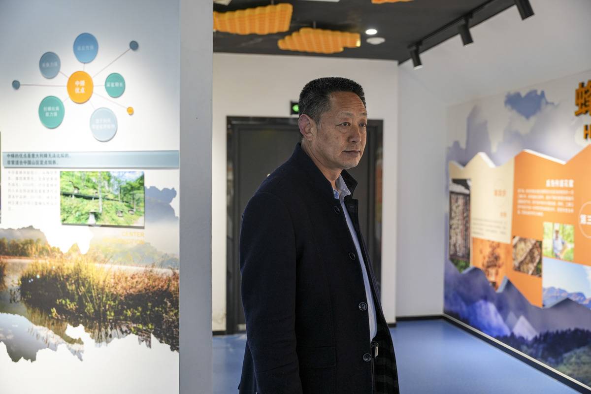 吴家庵保种场负责人郭家红带领游客参观中蜂科普馆。