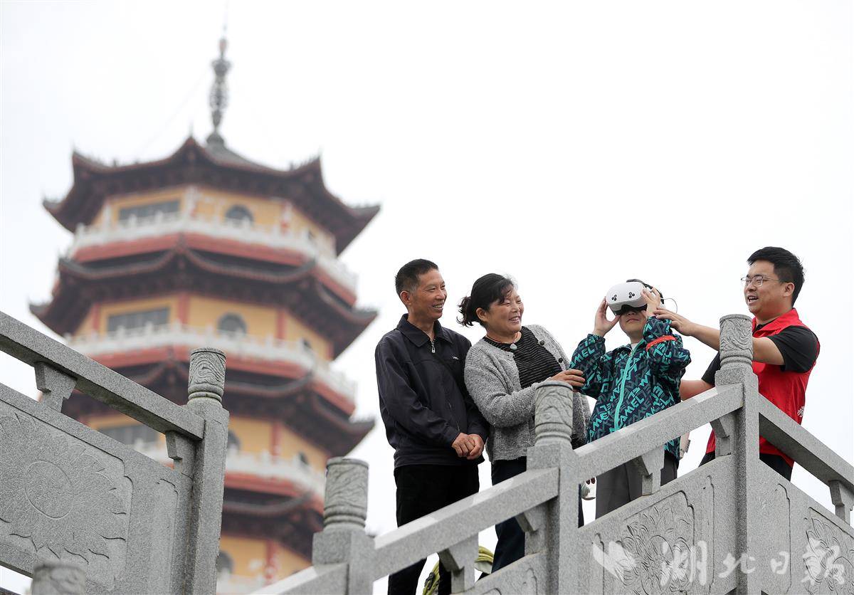 4月6日,在荆门市沙洋县纪山镇纪山寺,荆门市博物馆开展“流动博物馆”进景区活动,游客戴上vr眼镜,瞬间“穿越”至战国楚地,见证楚简制作过程。