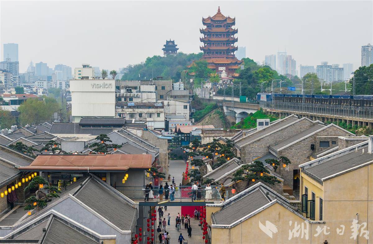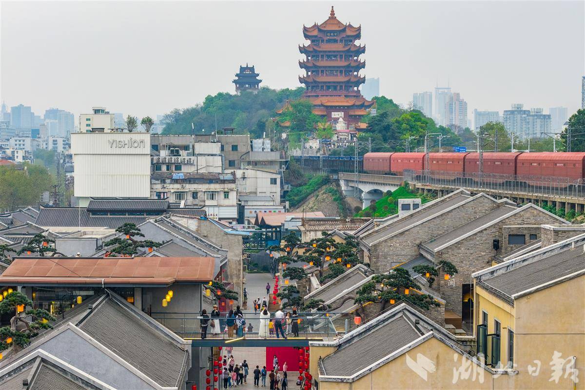 4月6日,武汉武昌古城斗级营街区,游客与黄鹤楼、火车、老街同框。