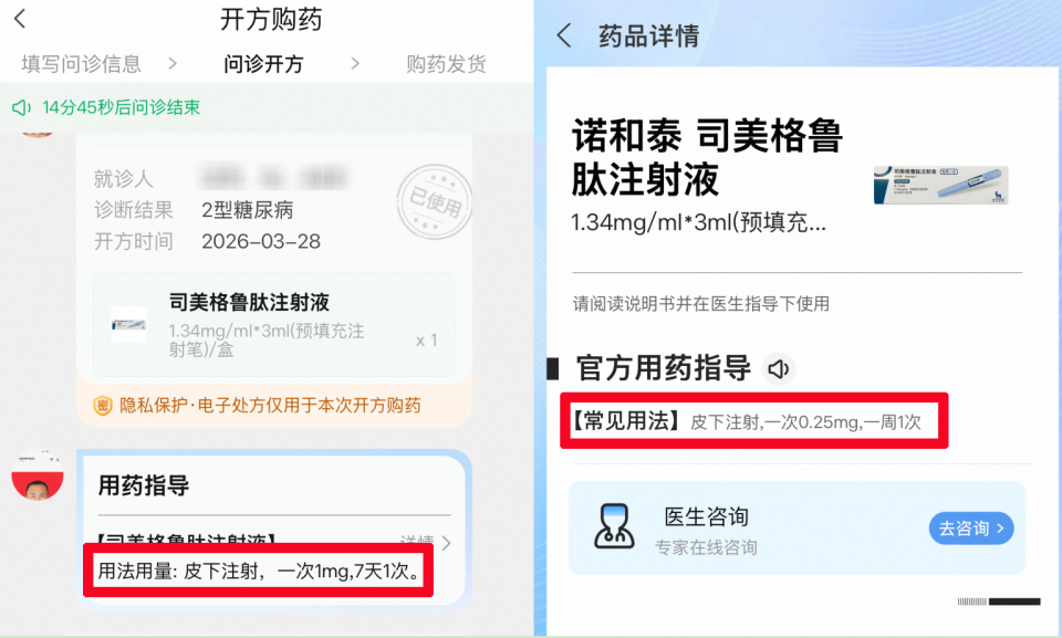 记者分别用自己和他人身份信息体验购买,发现只需填写基础信息,随意勾选“肥胖”或“糖尿病”,即可快速获取电子处方并下单。在不同商家下单时,发现同一商家对不同病症开具相同剂量,不同商家对同一病症开具剂量却各不相同,部分处方还与官方用药指导严重不符。如司美格鲁肽官方用药指导称,首周0.25mg,但线上处方开出一周1mg。