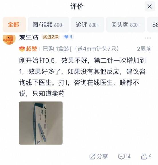 网友“爱生活”吐槽:刚开始打0.5mg,效果不好,第二针一次增加到1mg,咨询在线医生,啥都不说,只知道卖药。
