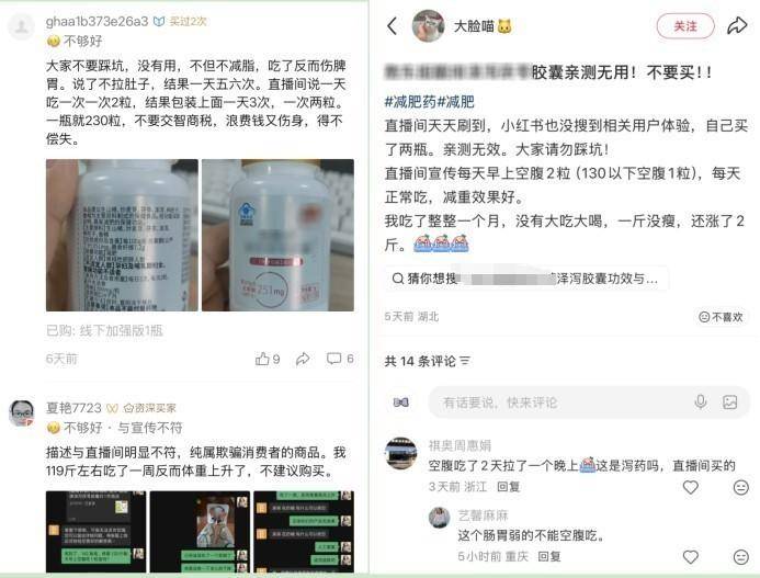 无独有偶,在武昌某机关单位上班的胡女士也反映,服用含有“泽泻”中药成分的保健品半月,体重未降反而频繁出现肠胃痉挛。网友“ghaalb373e26a3”称,“泽泻”不但不减脂,吃了反而伤脾胃,直播间宣传每天早上空腹2粒,结果包装上面一天3次,一次两粒。还有多名网友反映,服用该产品后腹泻不止,浪费钱又伤身,得不偿失。