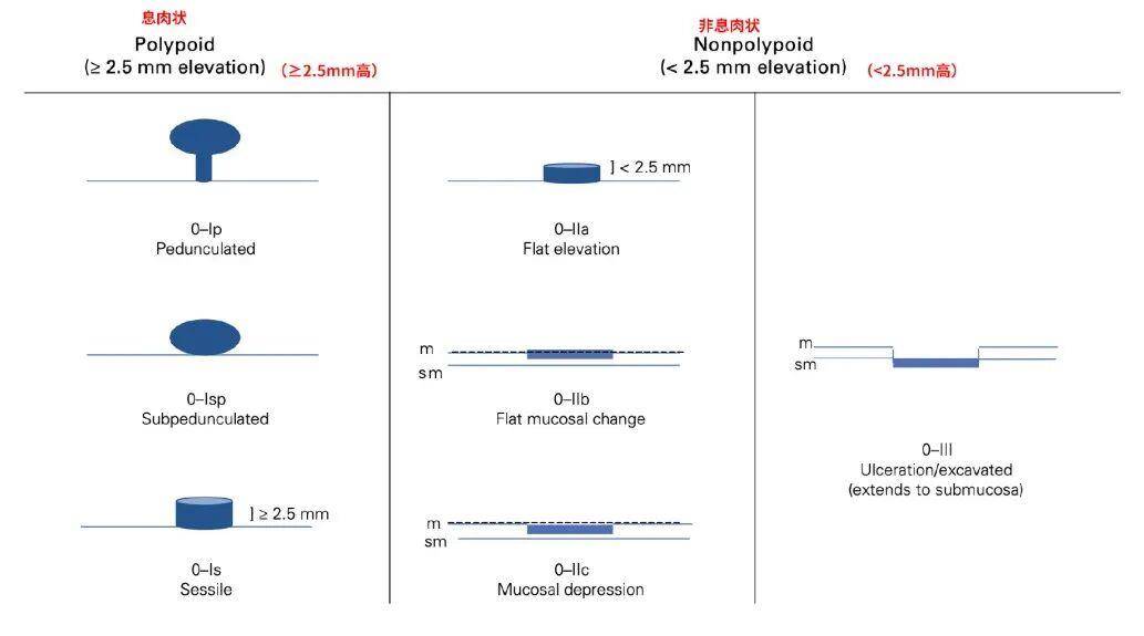 0-Ip(有蒂型):恶性风险较低。0-Is(广基型):恶性风险较高。0-IIa(浅隆起型):恶性风险较低。0-IIb(平坦型):恶性风险较低。0-IIc(浅凹陷型):恶性风险较高,6~10mm的病变风险超过40%,大于20mm的病变风险约为90%。0-III(溃疡性或凹陷性型):几乎所有此类病变都包含高级别癌症。