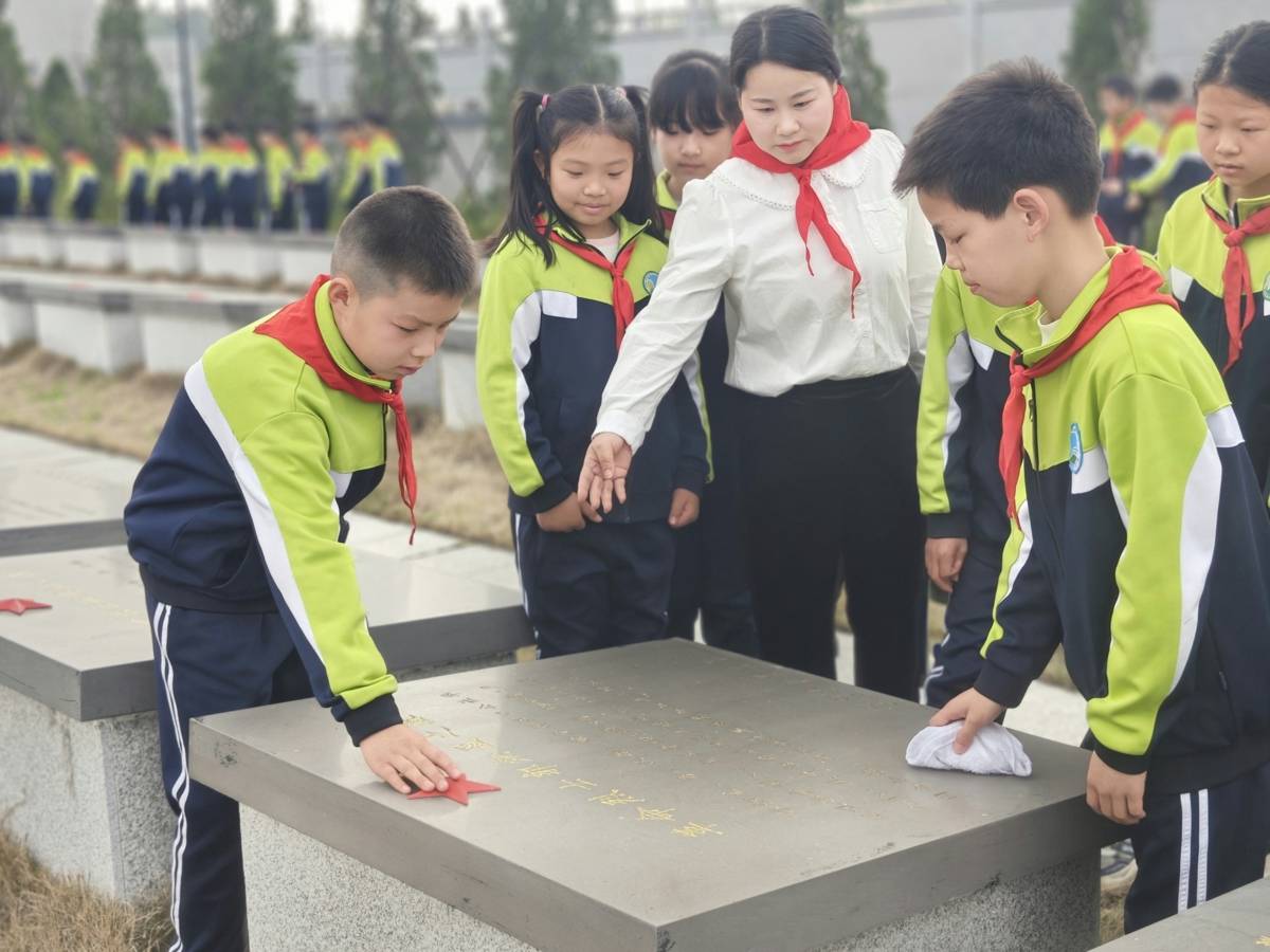 师生们正在擦拭烈士墓碑。