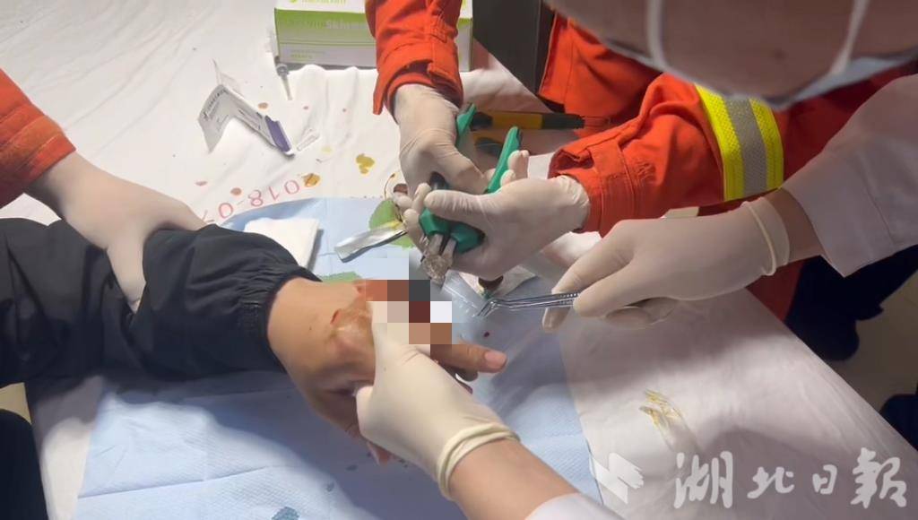 湖北日报讯 (记者童晨曦、通讯员魏欢欢)4月6日下午,荆门市掇刀区一名因工受伤的年轻男子左手无名指被铂金戒指死死卡住,医院无法处置。当地消防救援人员迅速到场,仅用两分钟便成功将戒指取下,为后续治疗争取了宝贵时间。