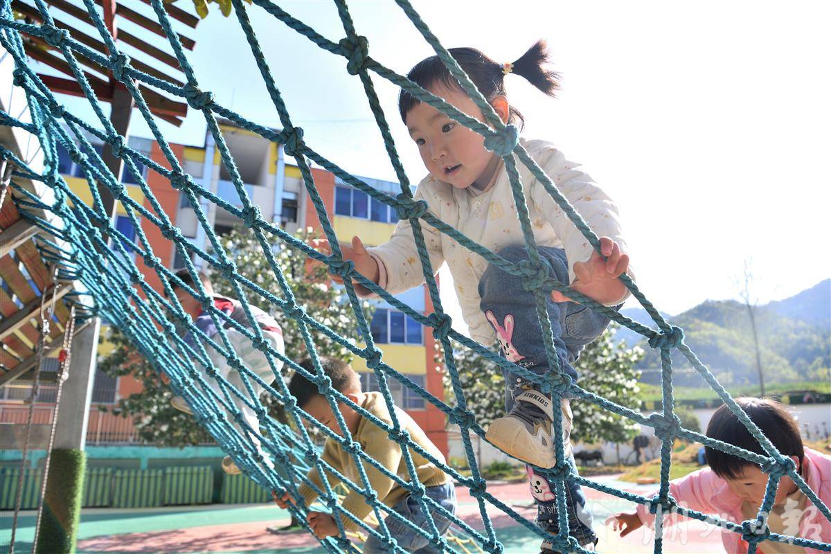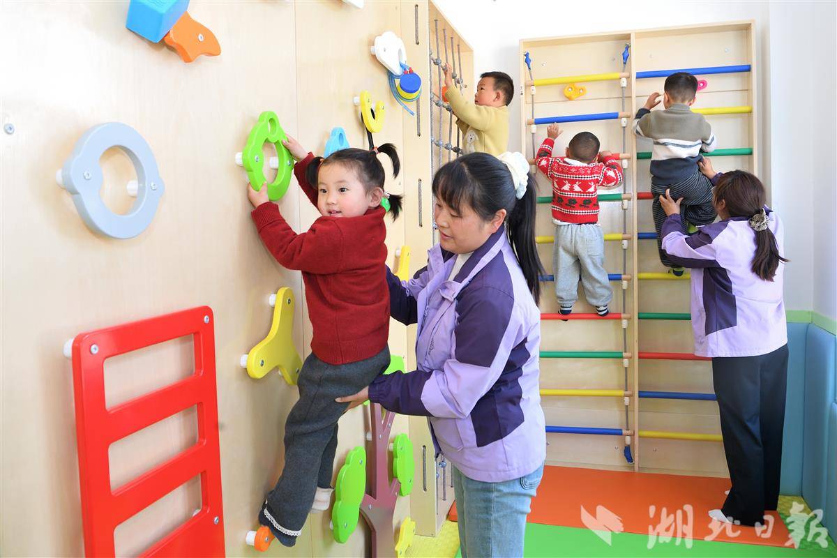 4月1日,在保康县歇马镇中心幼儿园托育班,小朋友在老师的陪伴下进行攀爬锻炼。