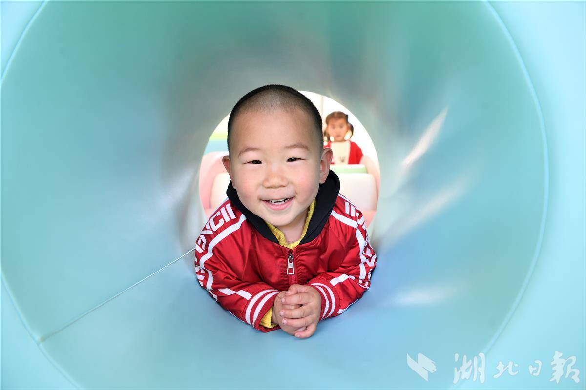4月1日,在保康县歇马镇中心幼儿园托育班,小朋友在游乐设施内玩耍。