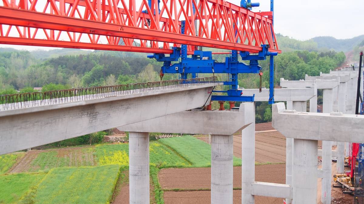 平宜高速襄阳段起于襄阳市南漳县九集镇方家集,止于襄阳、宜昌交界打鼓台附近,全长55.708千米,桥隧比46.87%,共设置各类桥梁61座,需预制梁板4313片。首片箱梁成功架设,标志着项目桥梁下部结构与上部结构施工进入平行推进新阶段。